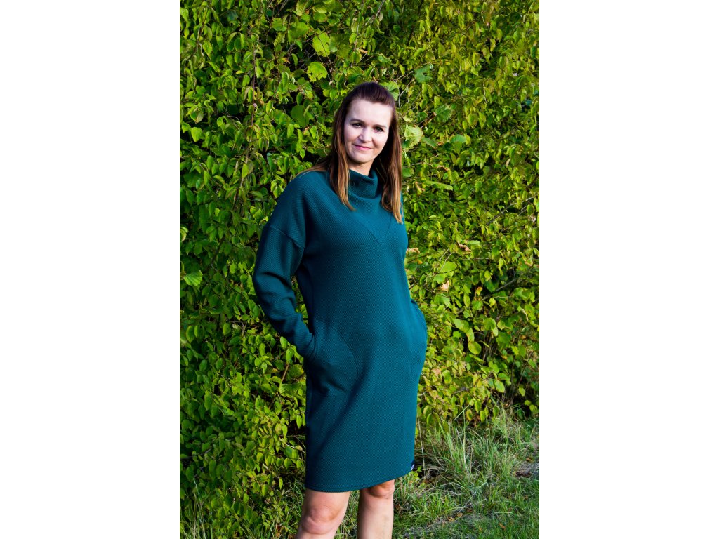 Šaty z 3D teplákoviny s dlouhým rukávem a kapsami po stranách. Sktyré zipy jsou ukryty po stranách.