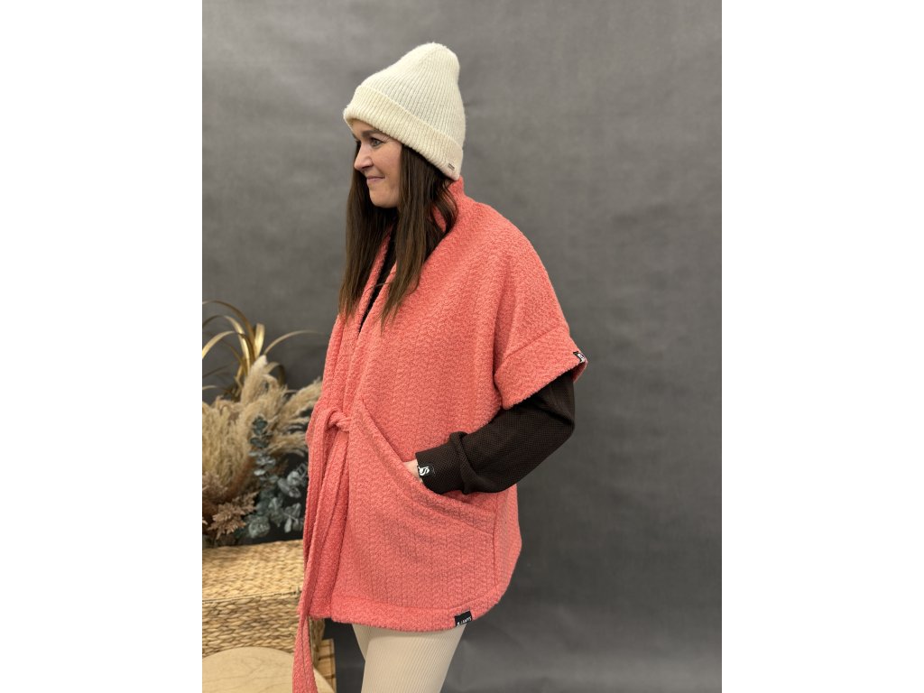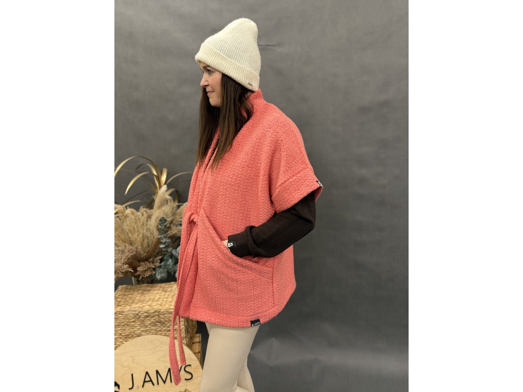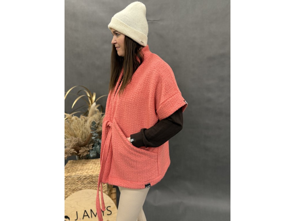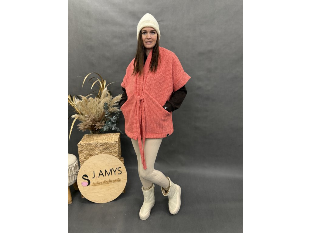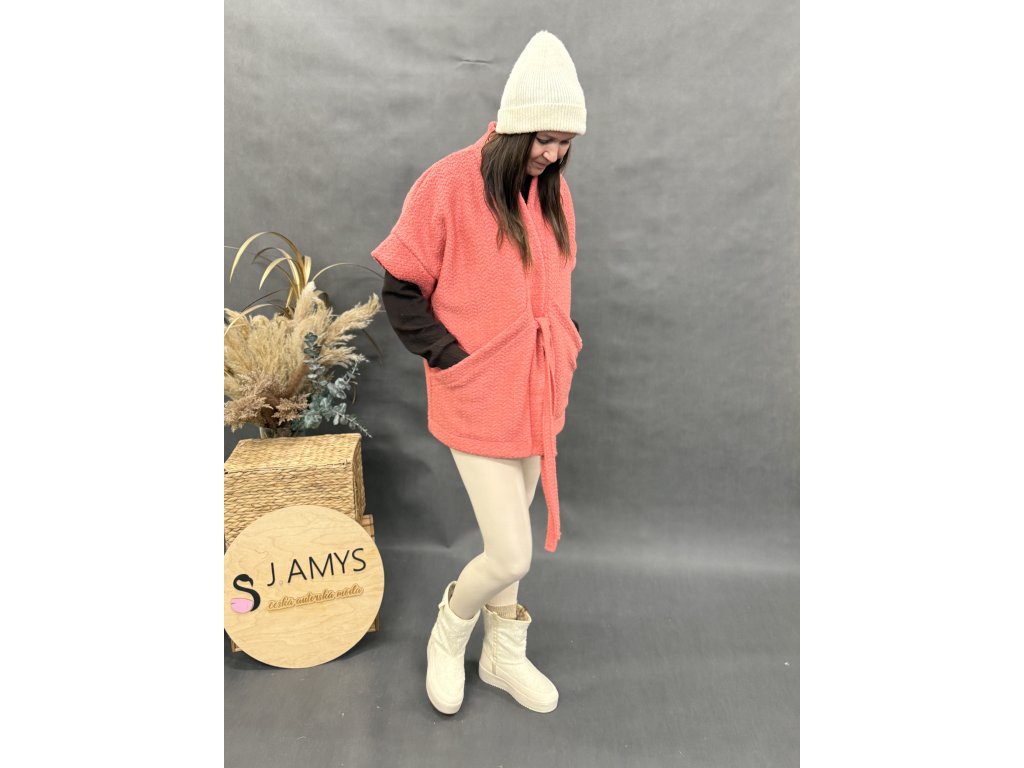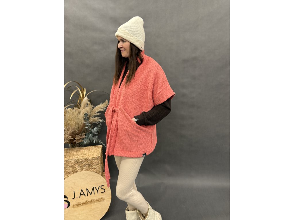 Stylová dámská kabátková vesta z hřejivé svetroviny v jemném korálovém odstínu. Měkký strukturovaný materiál krásně zahřeje a zároveň působí elegantně a moderně. Díky volnějšímu střihu se skvěle vrství přes mikiny, svetry i lehké bundy.