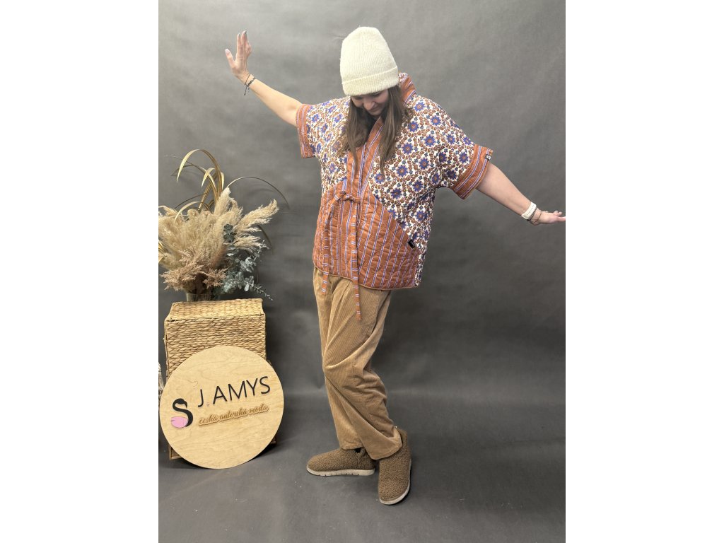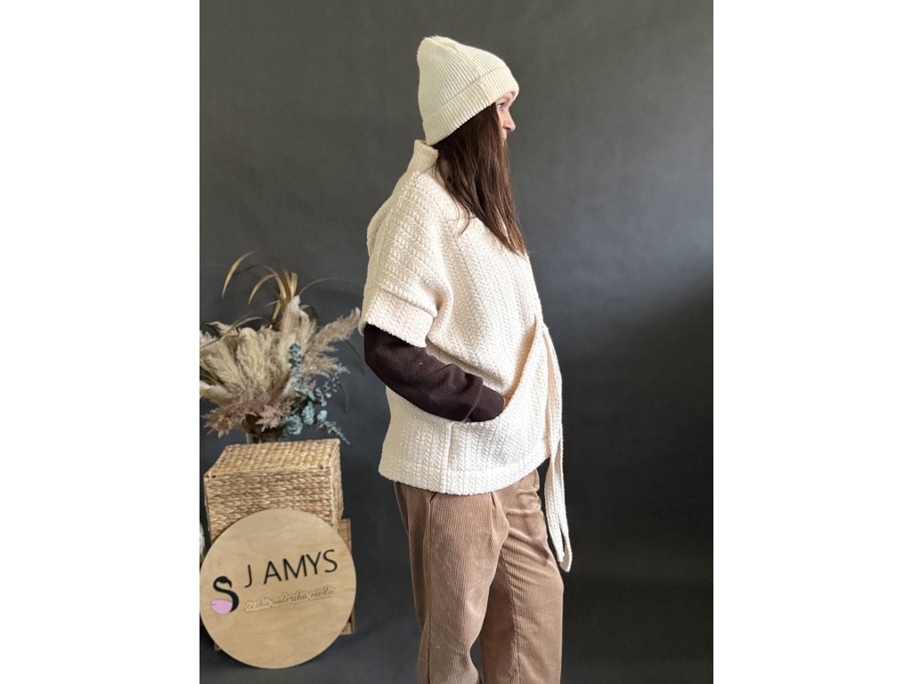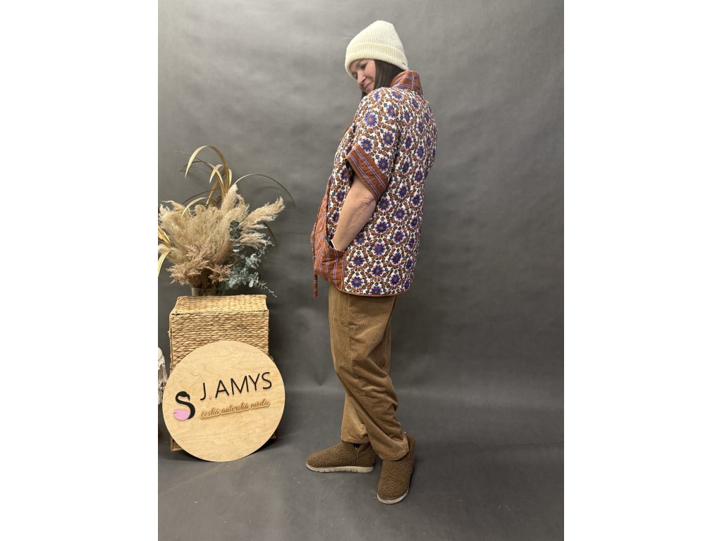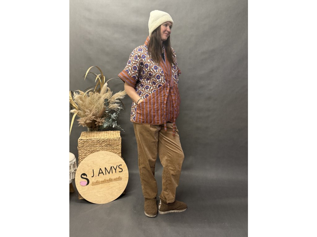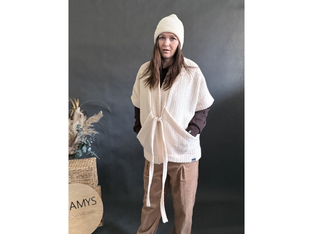 Vesta má krátké rukávy, praktické kapsy a zavazování v pase, které umožňuje regulovat siluetu podle potřeby. Ideální jako přechodový kousek na podzim, jaro i chladnější letní večery.