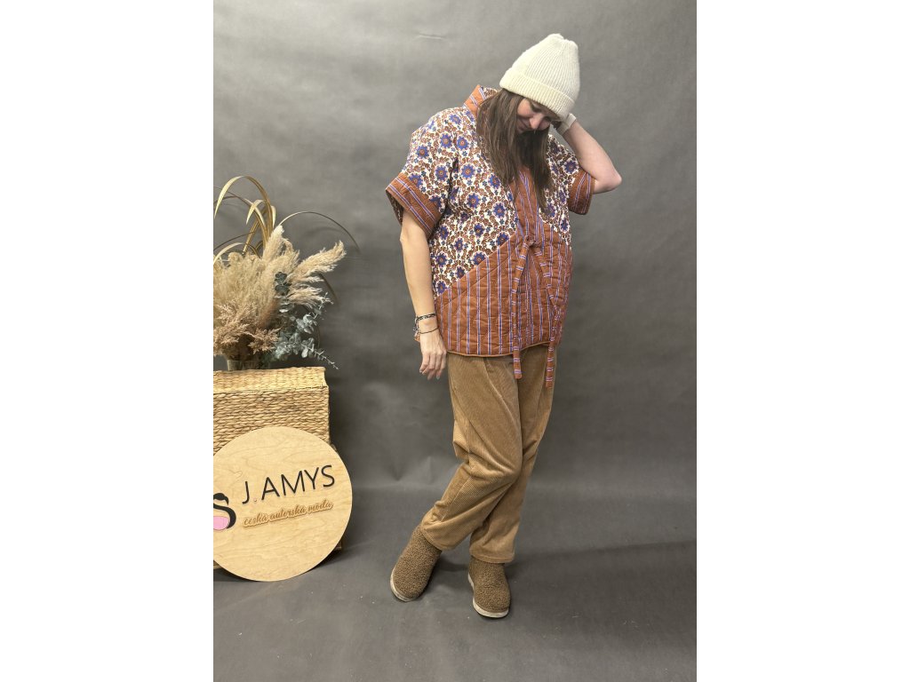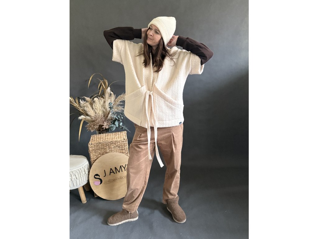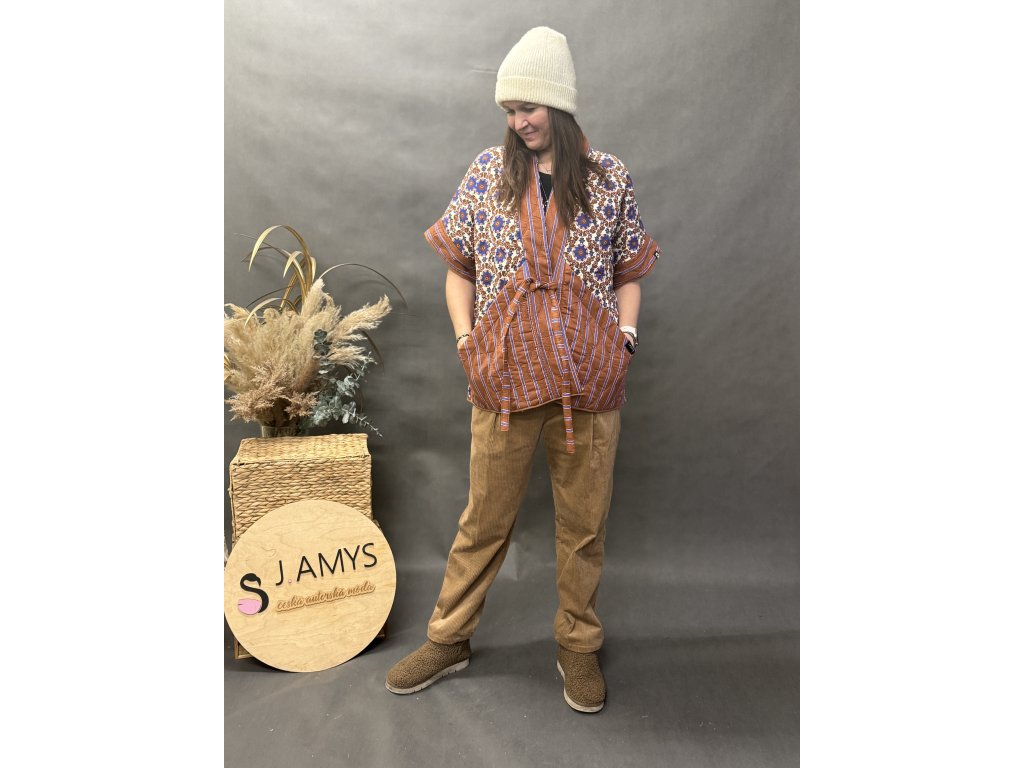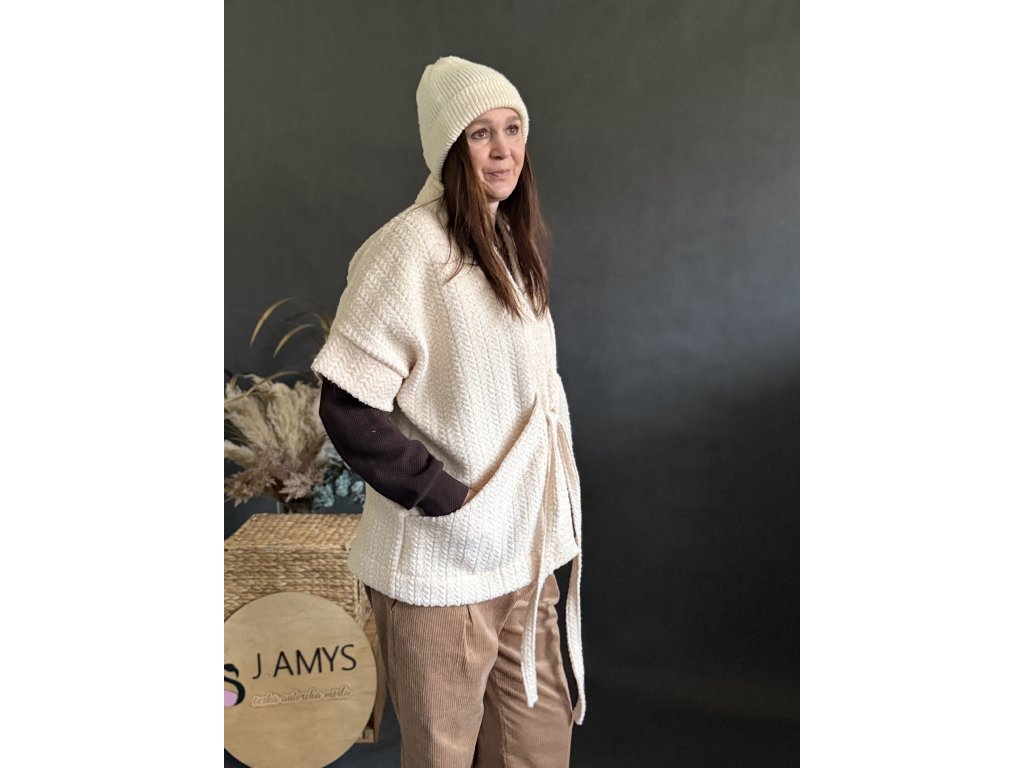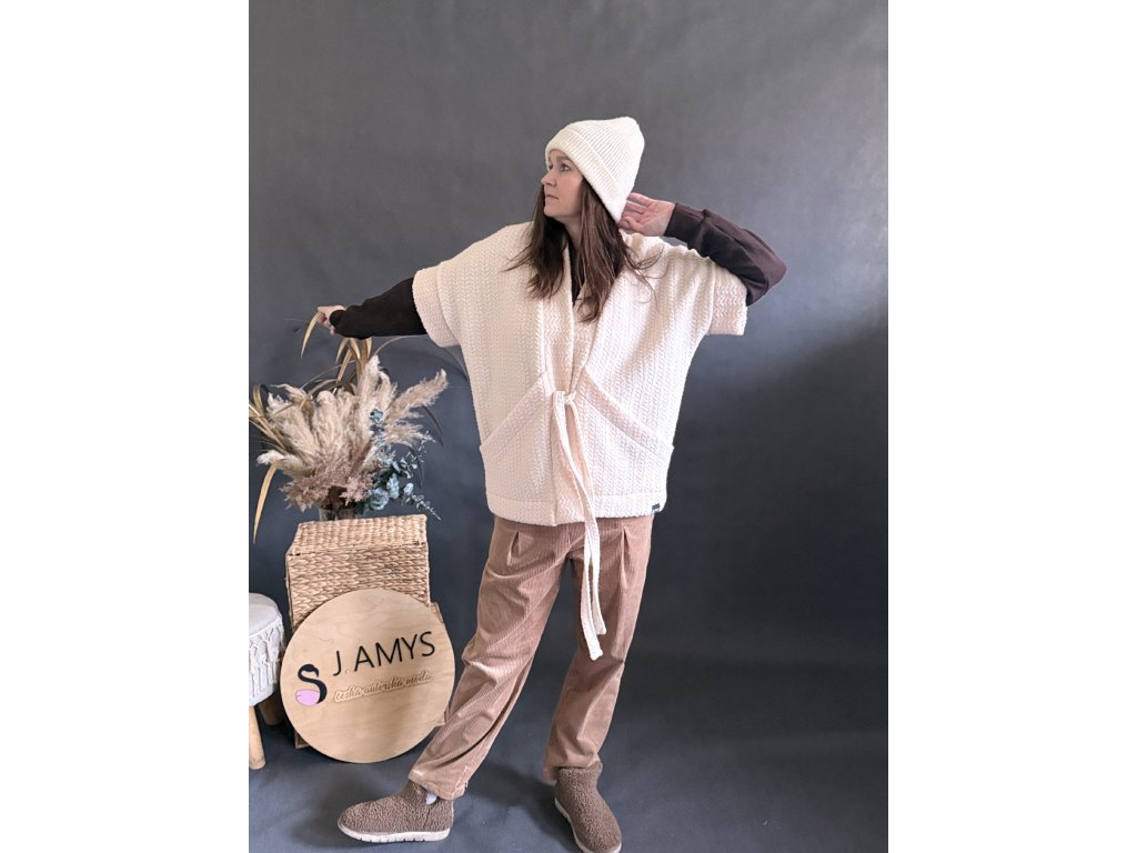 Vesta má krátké rukávy, praktické kapsy a zavazování v pase, které umožňuje regulovat siluetu podle potřeby. Ideální jako přechodový kousek na podzim, jaro i chladnější letní večery.
