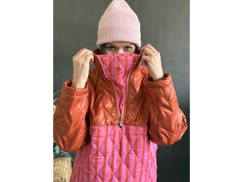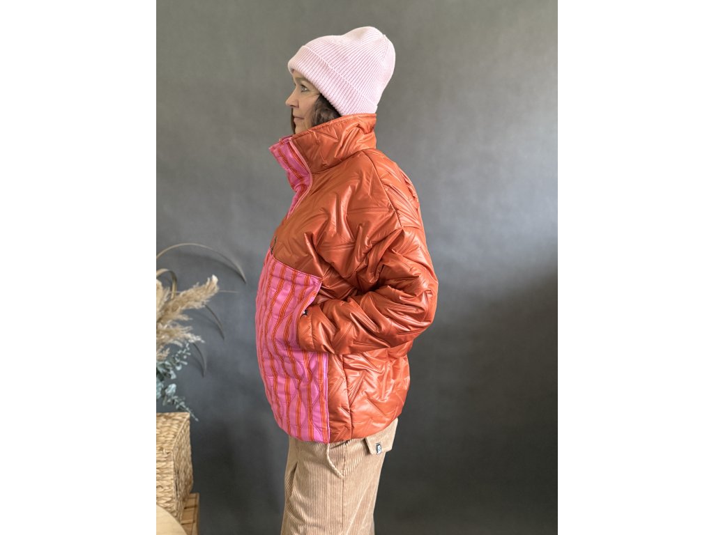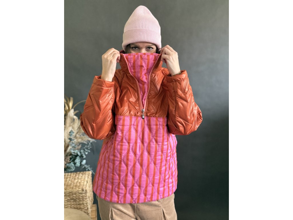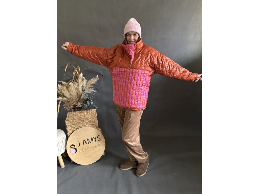 Naprosto úžasná dámská prošívaná bunda, která spojuje pohodlí, funkčnost a výrazný design. Kombinace syté oranžové a růžové barvy s dekorativním proševem vytváří originální look, který okamžitě zaujme a rozzáří každý outfit.