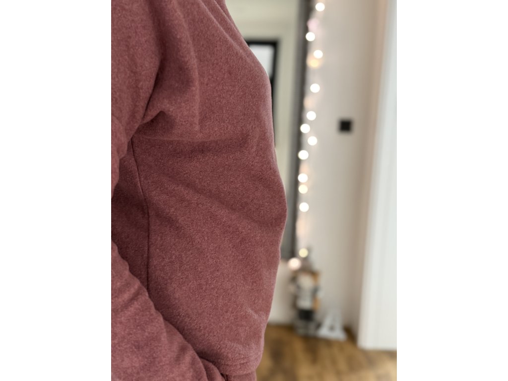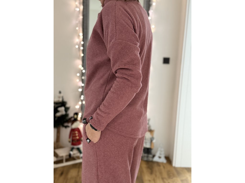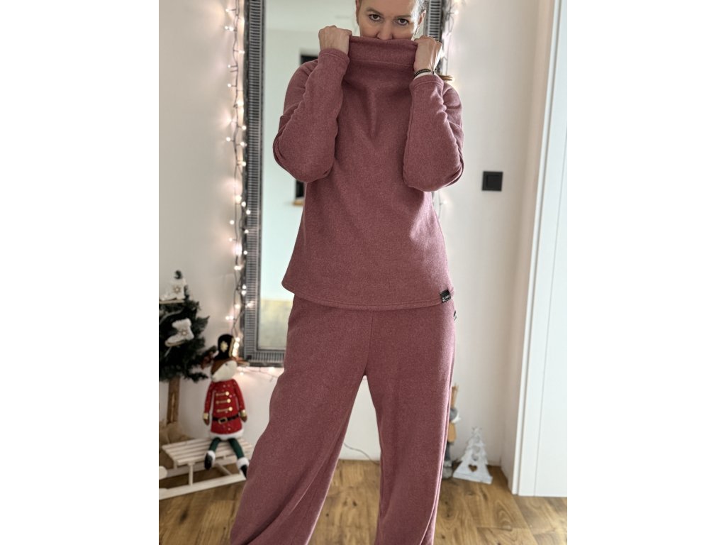 Tento nádherný set si zamilujete, je prostě dokonalý. Kdo se chce cítit pohodlně a hlavně v teploučku tak tento set Vám nesmí chybět ve vašem šatníku. Kalhoty jsou široké s kapsami a gumou v pase. A halenka má stojáček volného střihu a vepředu kratší a vzadu prodloužené.