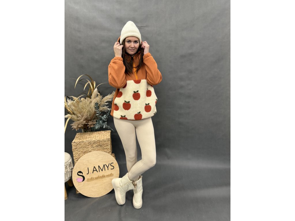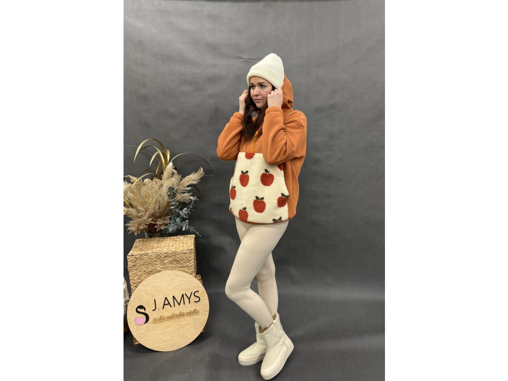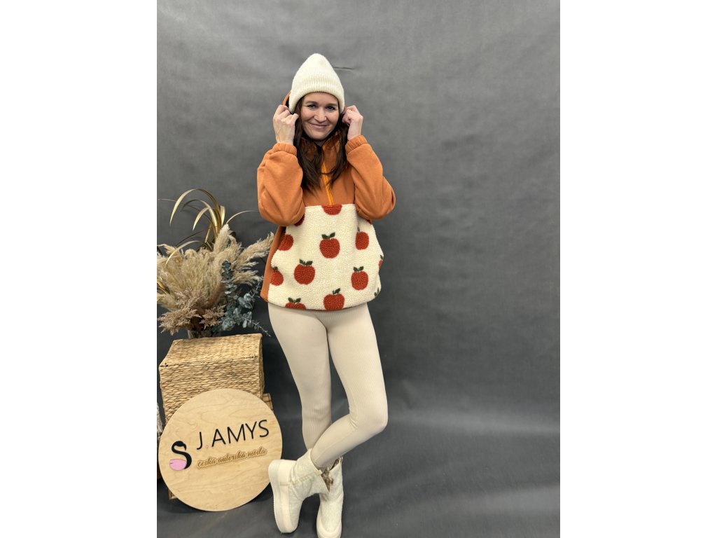 Originální dámská oversize mikina z hřejivé teplákoviny s hravým jablíčkovým vzorem. Kombinace teplé skořicové barvy a krémového základu s jablky vytváří výrazný, ale stále nositelný design, který rozzáří každý outfit.
