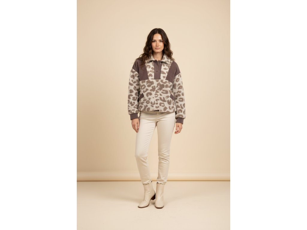 Stylová dámská oversize mikina GEPARD z hřejivého beránkového TEDDY s výrazným zvířecím vzorem. Kombinace krémového základu s hnědými gepardími skvrnami a kontrastními hnědými detaily vytváří moderní, ale stále nadčasový look.