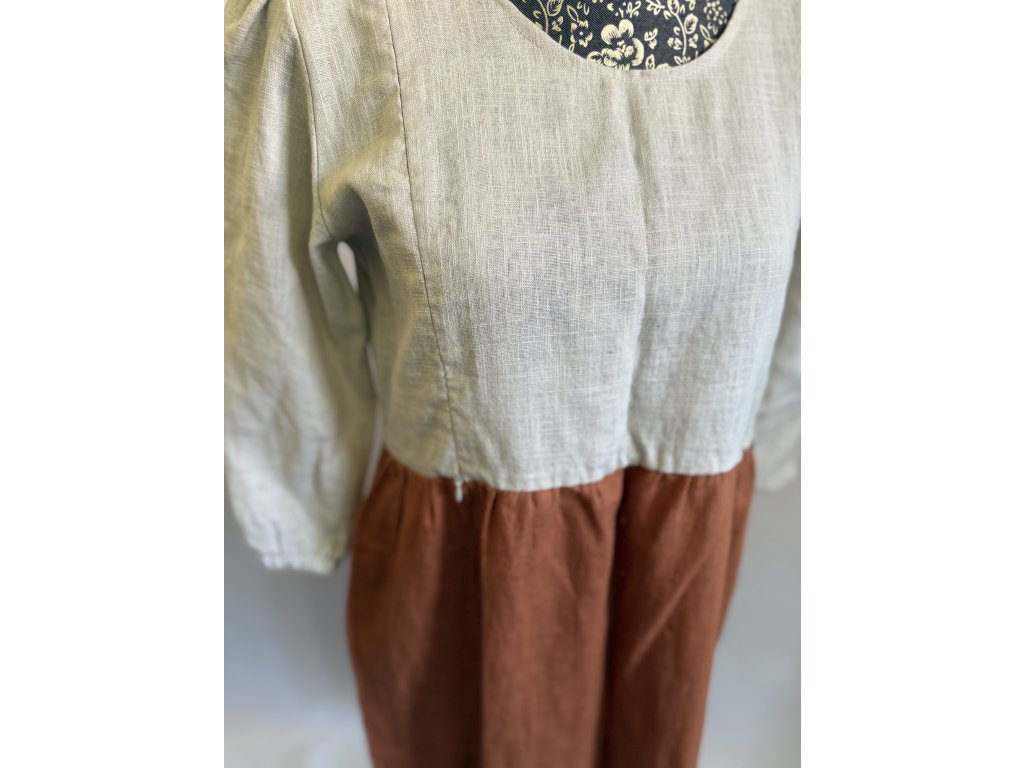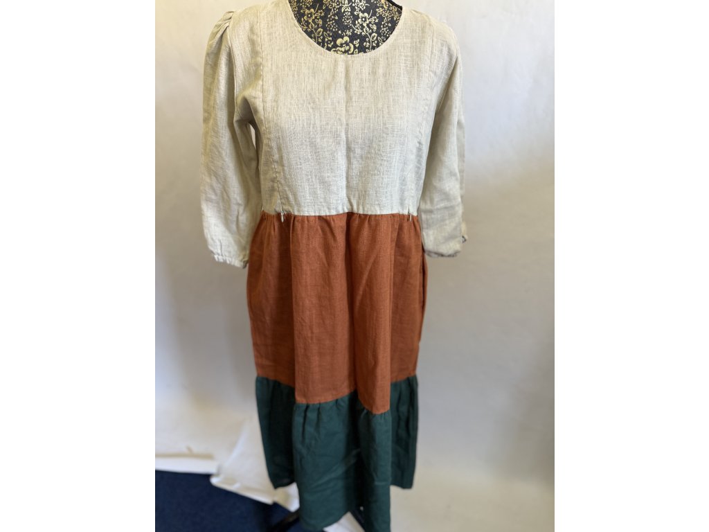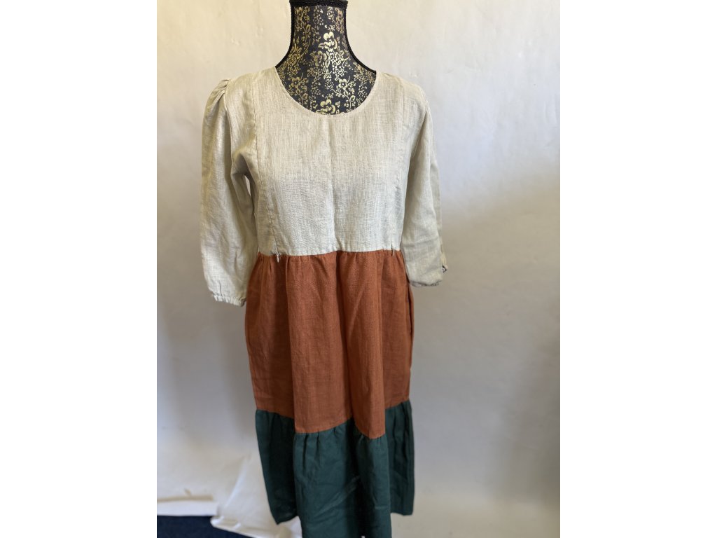 Nádherné lněné šaty s 3/4 rukávem do gumy a s volány a délka šatů je pod kolena a kapsami po stranách a se skrytými zipky na kojení.