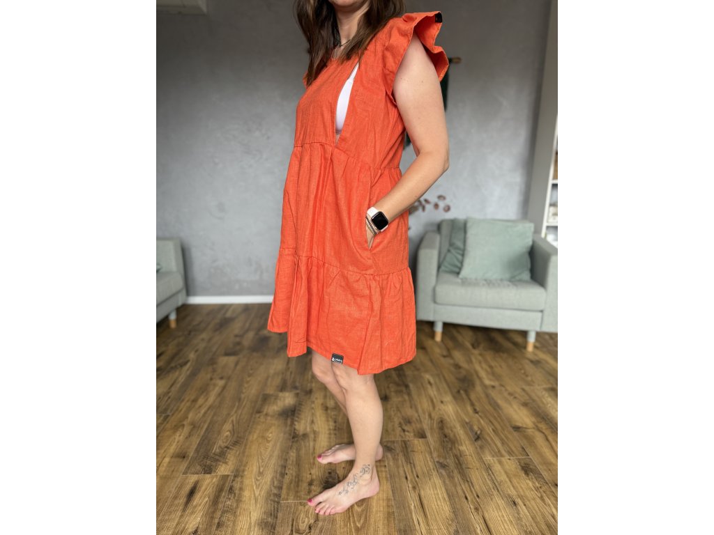 Nádherné lněné šaty s volánky a volánkový rukáv s kapsami. barva len oranž.