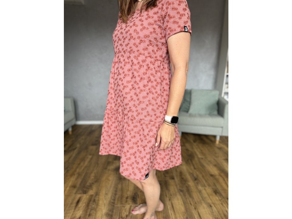 Nádherný vyšívaný mušelín v barvě růžové s červenými kytičkami. Je prostě úžasný. A tyto šatičky si zamilujete jsou s volány a krátký rukáv a kapsami.