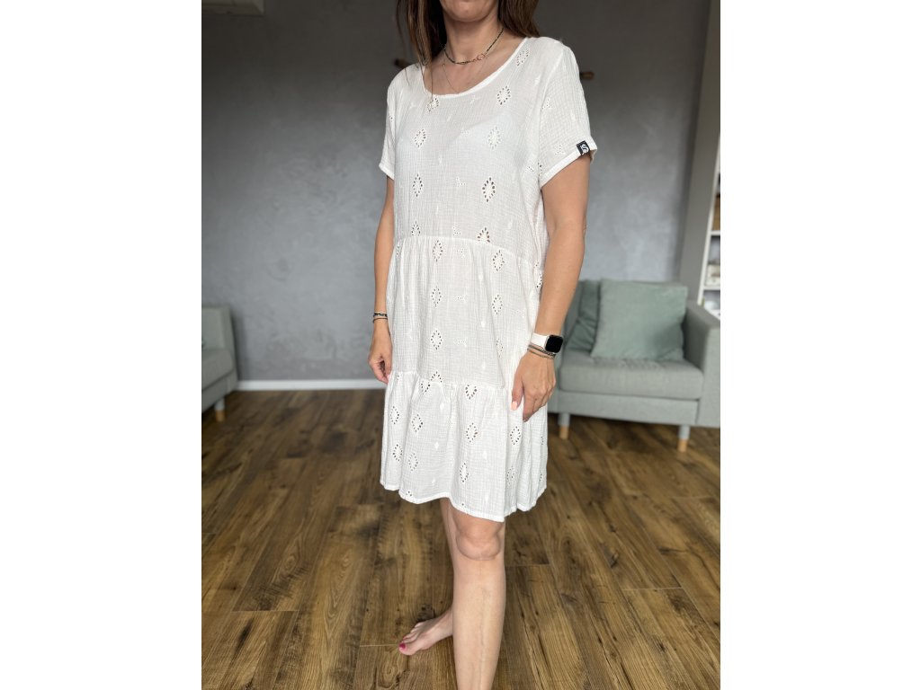 Nádherný smetanový vyšívaný mušelín a tyto šatičky s volány a krátký rukáv jsou prostě pecka.