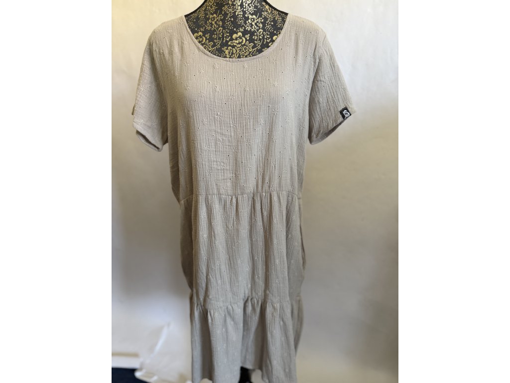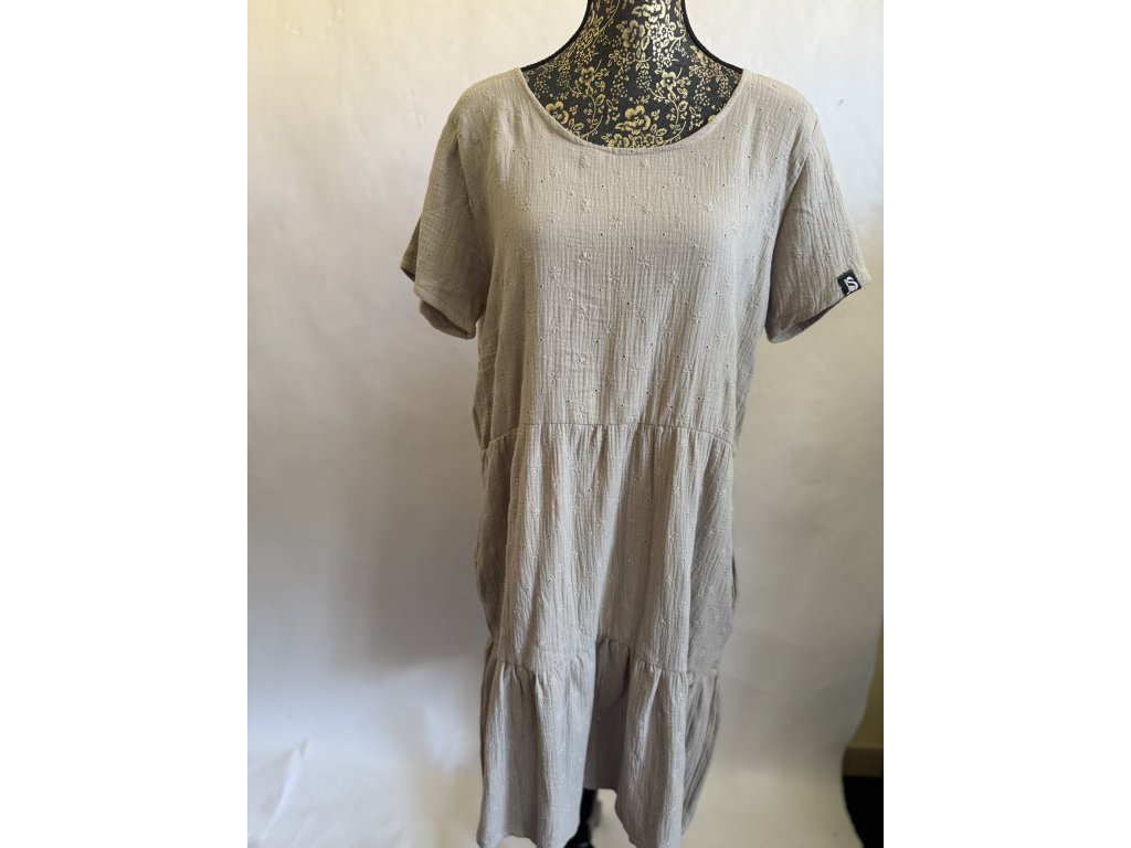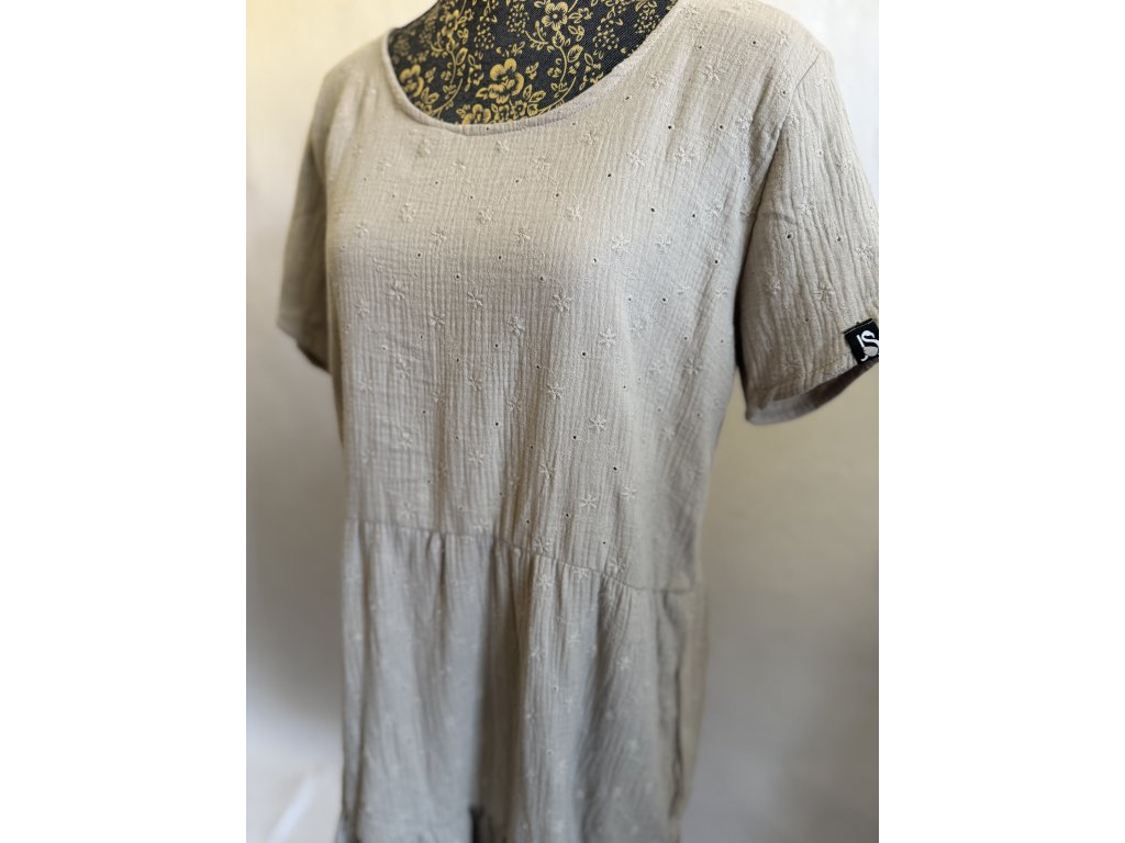 Krásný vyšívaný mušelín v barvě přírodní s kytičkami. Šaty jsou s volány a kapsami.