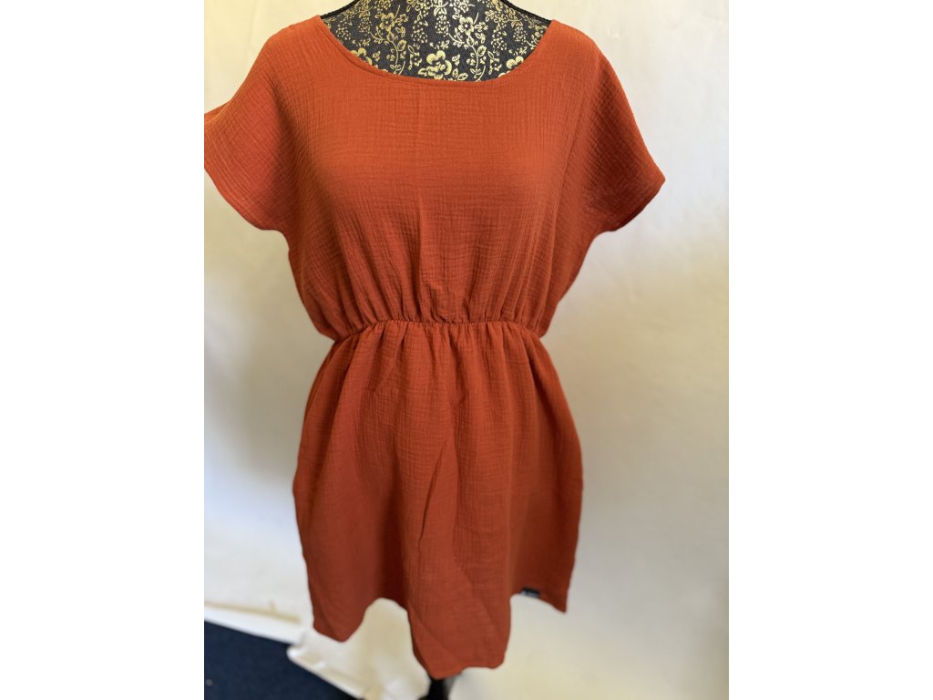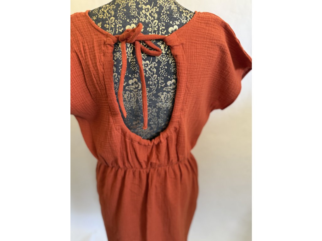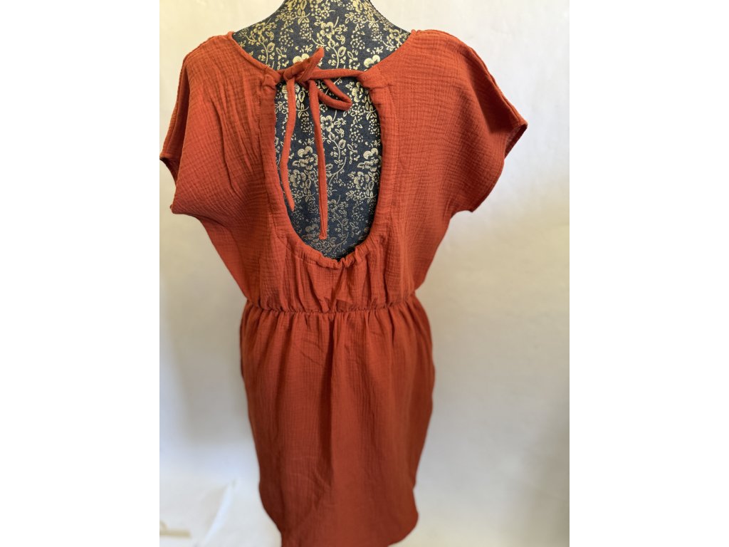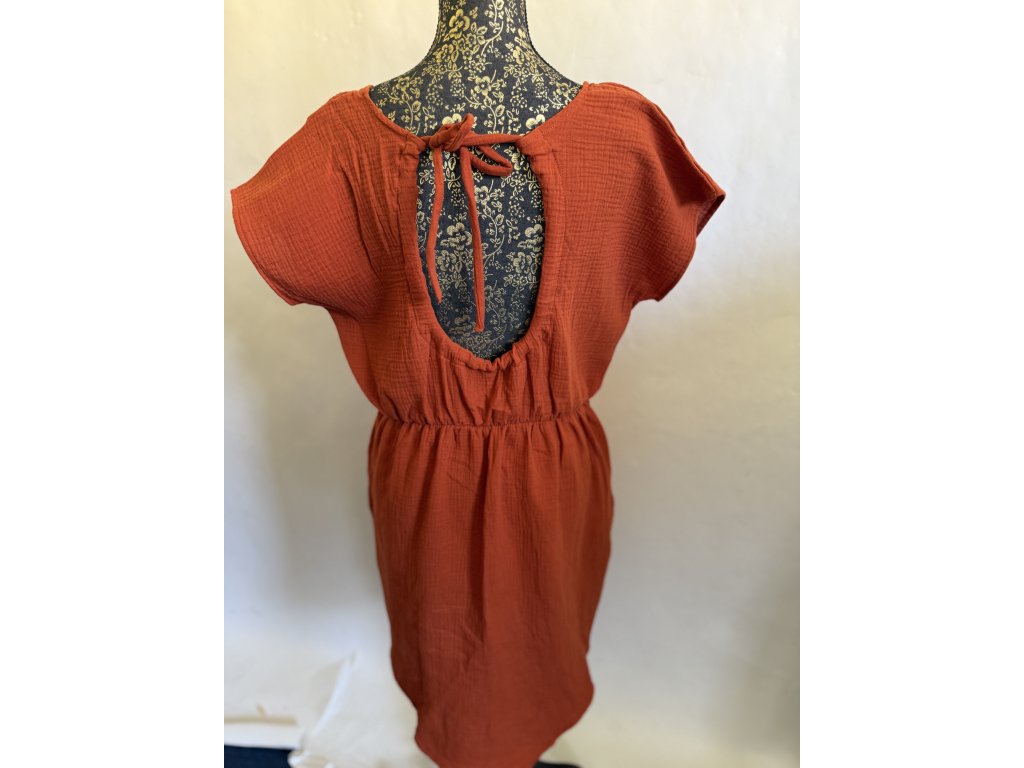 Mušelinové šaty s volnými zády a prodloužením vzadu a kapsami po stranách v barvě cihla.