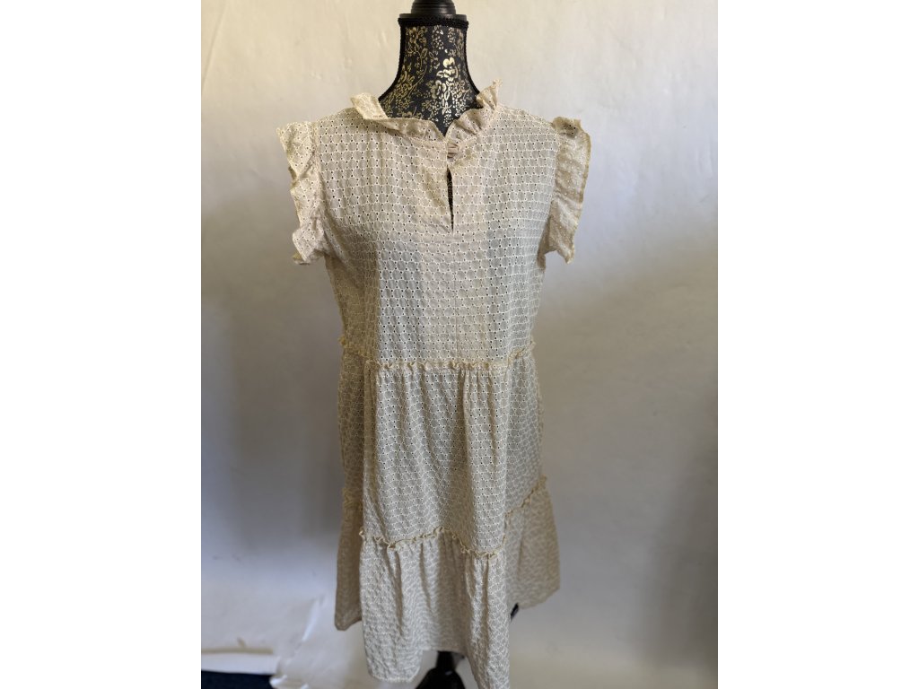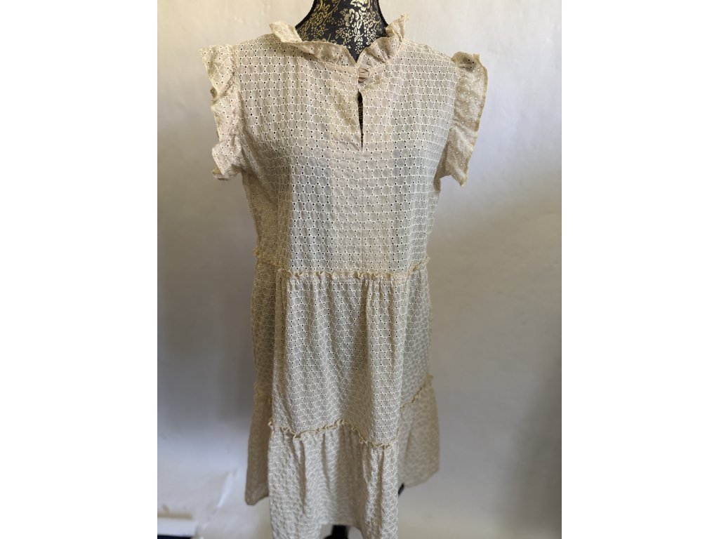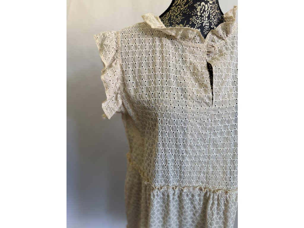 Nádherný vyšívaný mušelín v barvě smetana a šaty s volány a knoflíčkem u krku a volánkový rukáv. Jsou naprostá pecka.