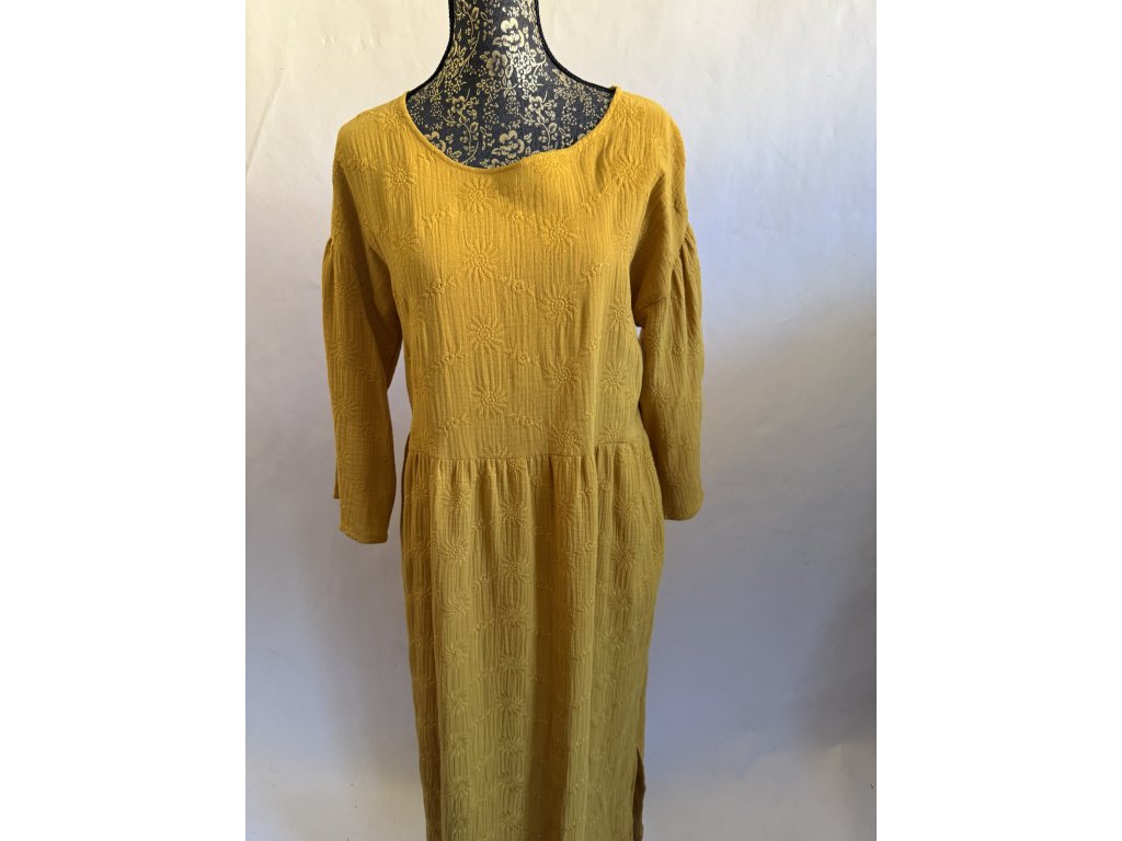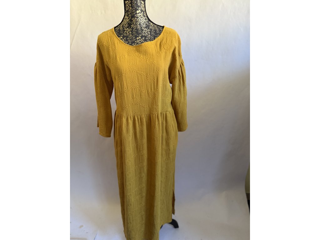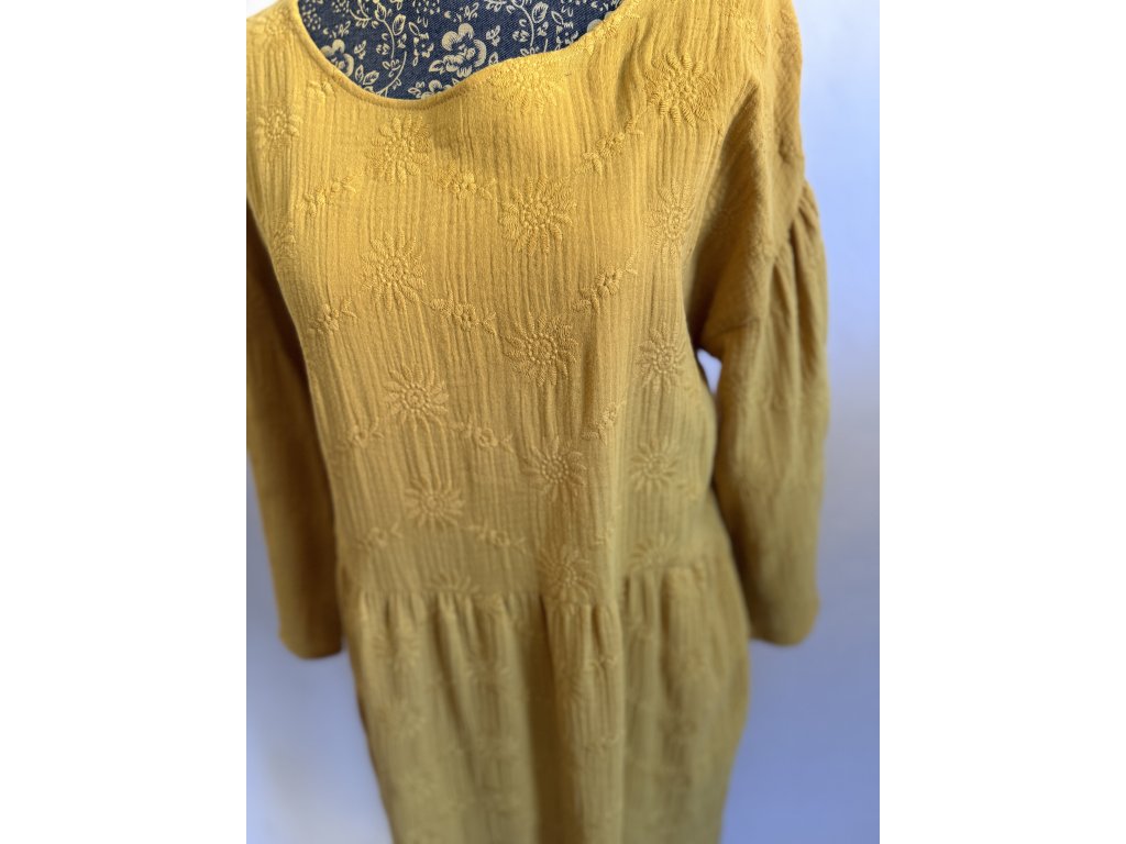 Nádherné boho styl šaty z vyšívacího mušelínu hořčice. Šaty mají volné rukávy a jsou velmi příjemné a vzdušné.