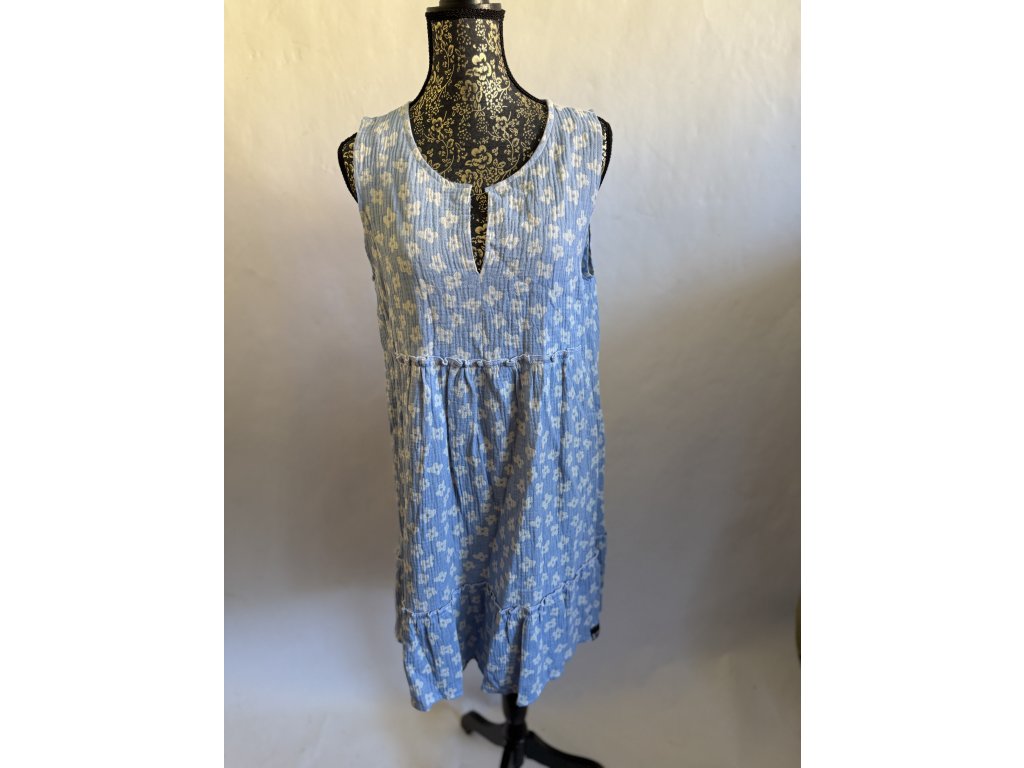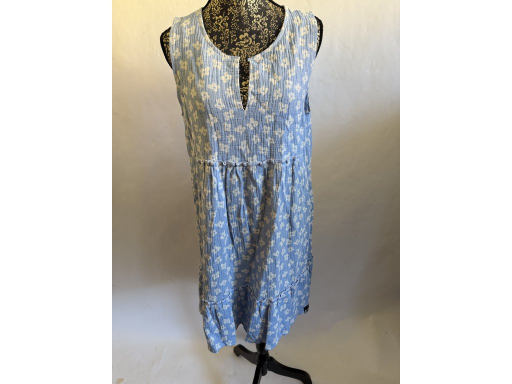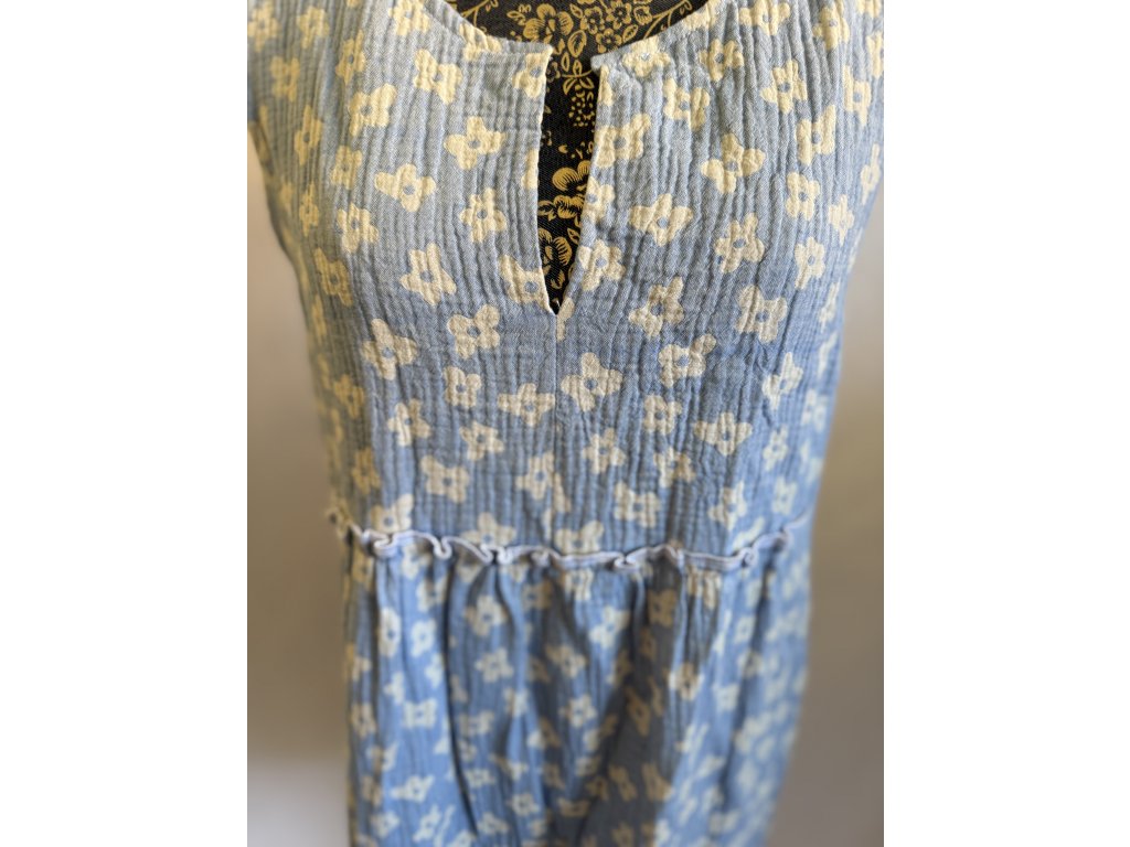 Nádherné mušelínové šaty v barvě světle modrý vzorovaný mušelín. Šaty mají volány a široká ramínka.