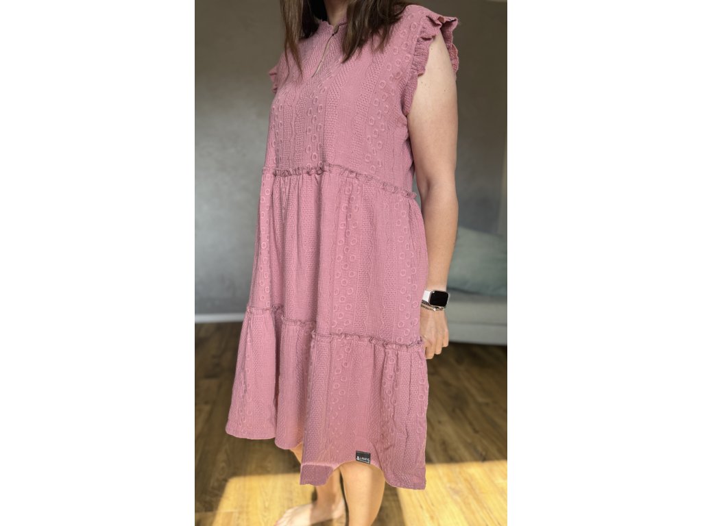 Nádherné šaty s volány a volánkový rukáv s kapsami a u krku na knoflíček velký výstřih. Barva mušelín starorůžový vyšívaný.