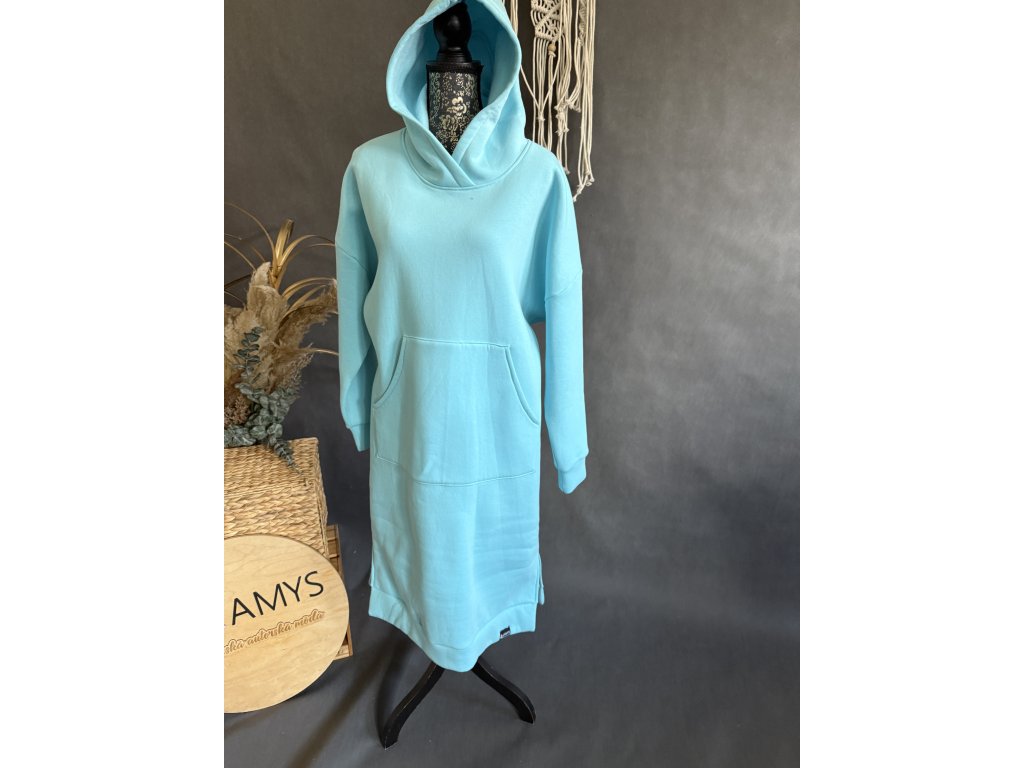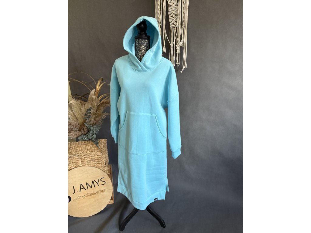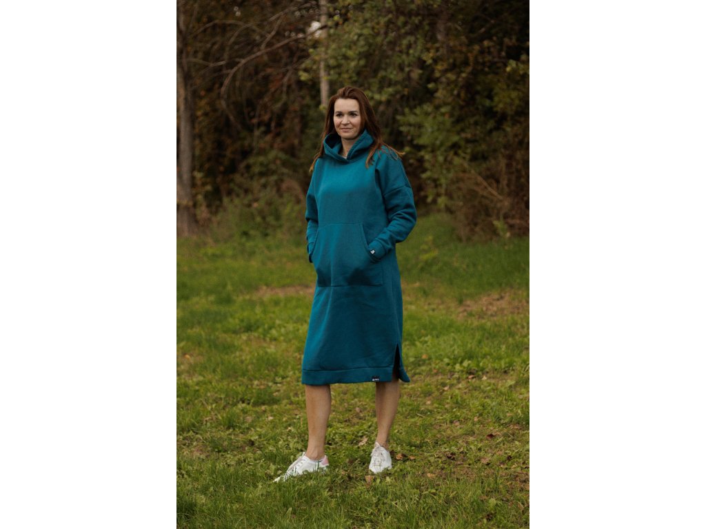 Dlouhé mikinošaty z teplé teplákoviny s velkou kapucí a klokaní kapsou.