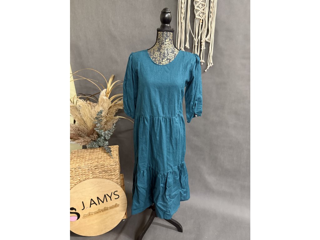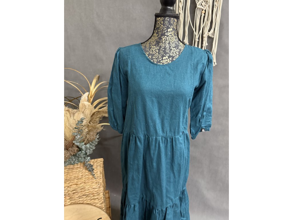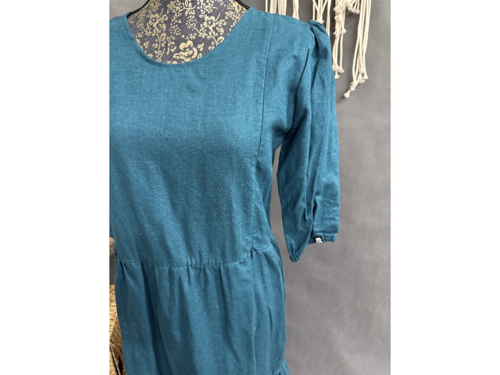 Nádherné lněné šaty v barvě Petrou s volány a 3/4 rukávem s kapsami a kojící.