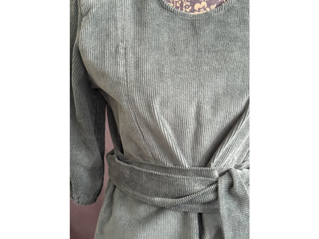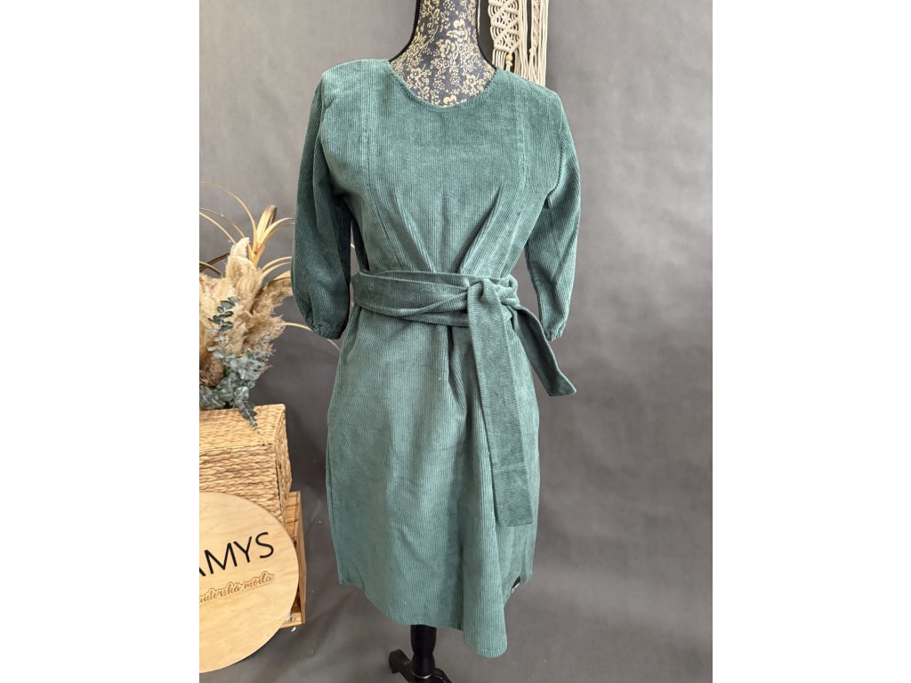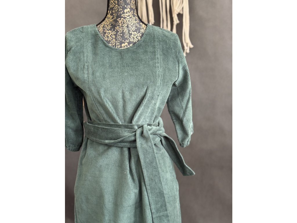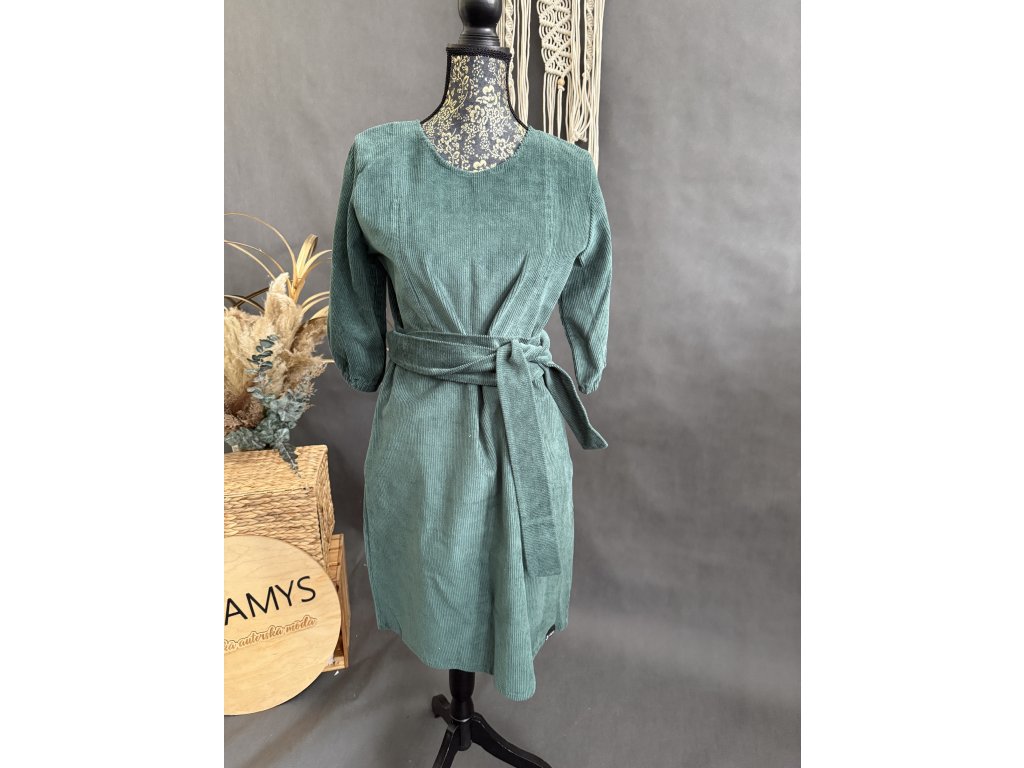 Nádherné manšestrové šaty v barvě zeleno/tyrkys s kojícími zipy a kapsami po stranách. Dají se stáhnout páskem.