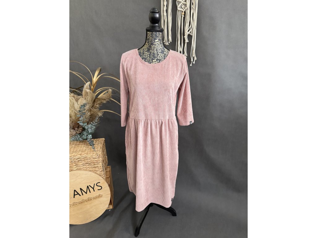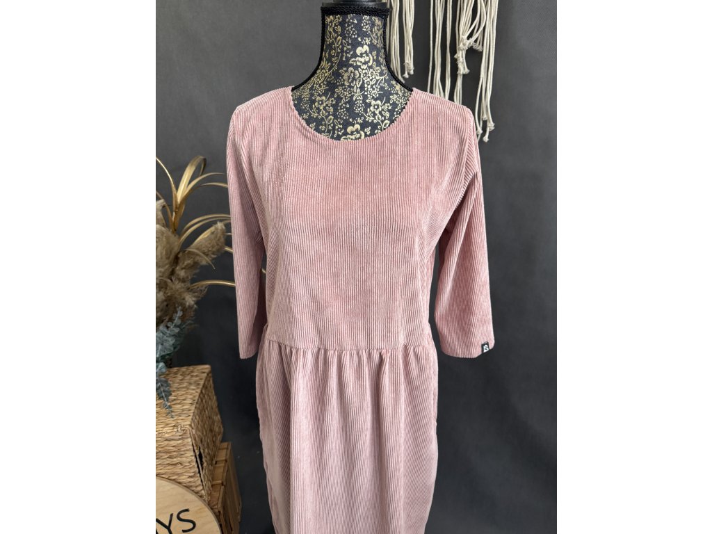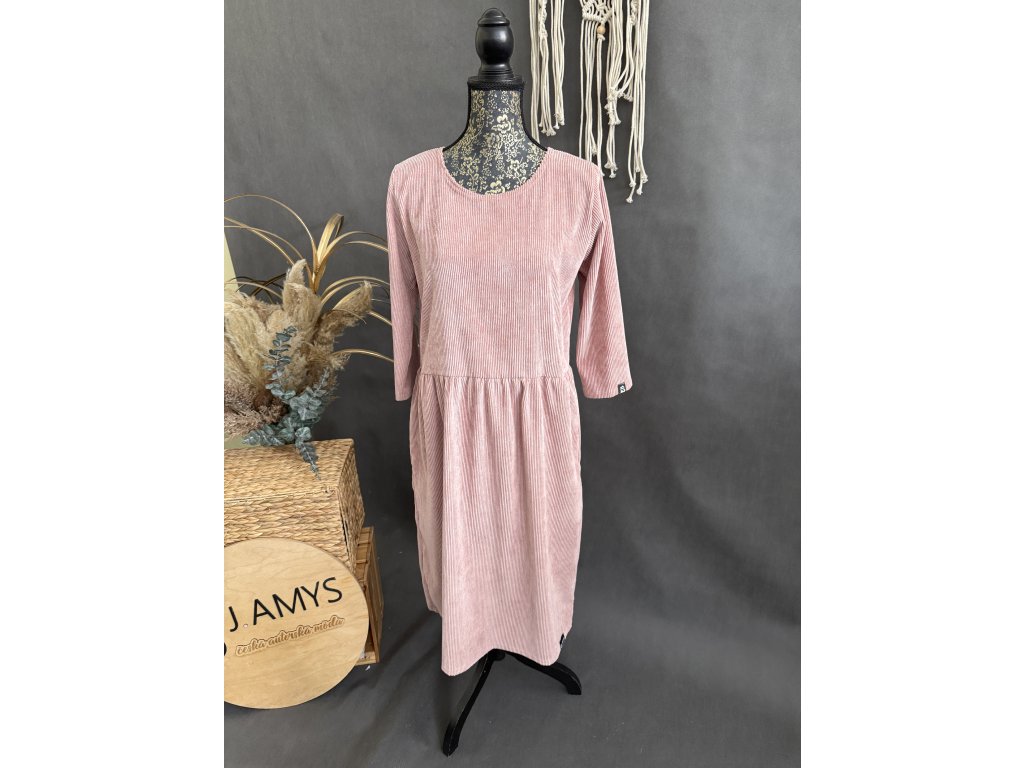 Manšestroé šaty v barvě starorůžová mají 3/4 rukáv do gumy a kapsy. Jdou dodělat i zipy na kojení.