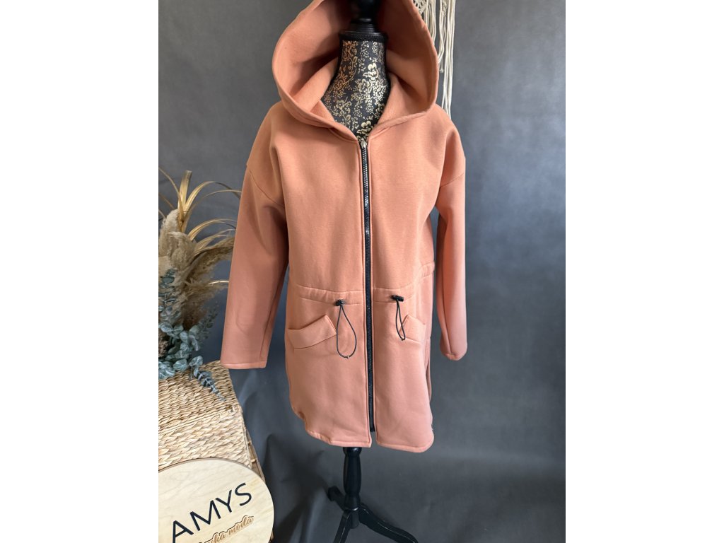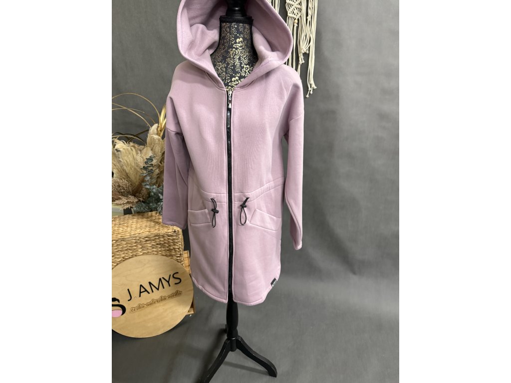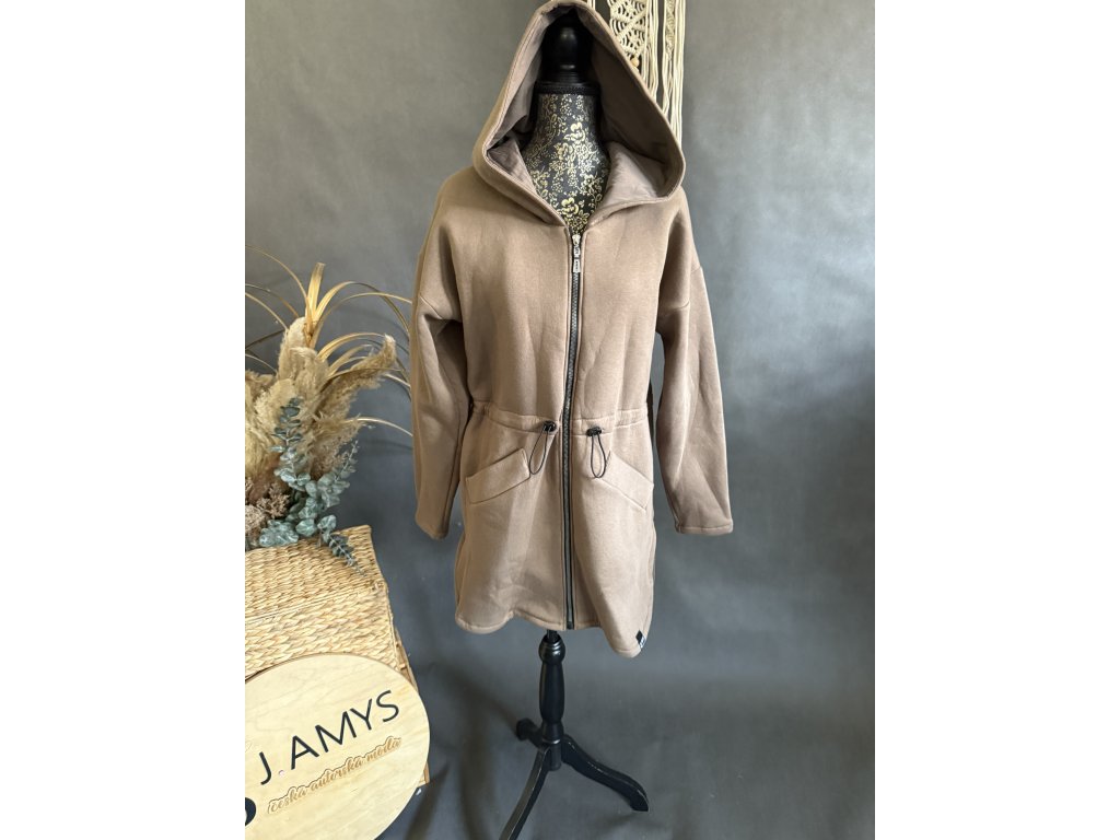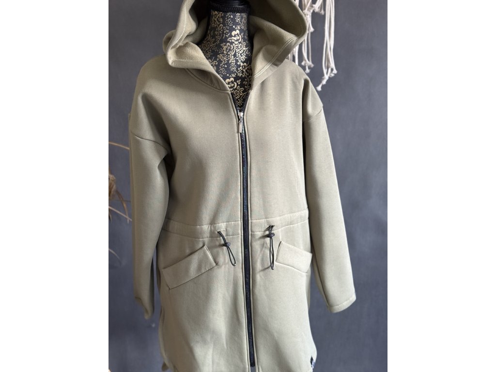 Elegantní mikina na zip s velkou kapucí a kapsami s gumou v pase. Velmi příjemná hřejivá teplákovina.