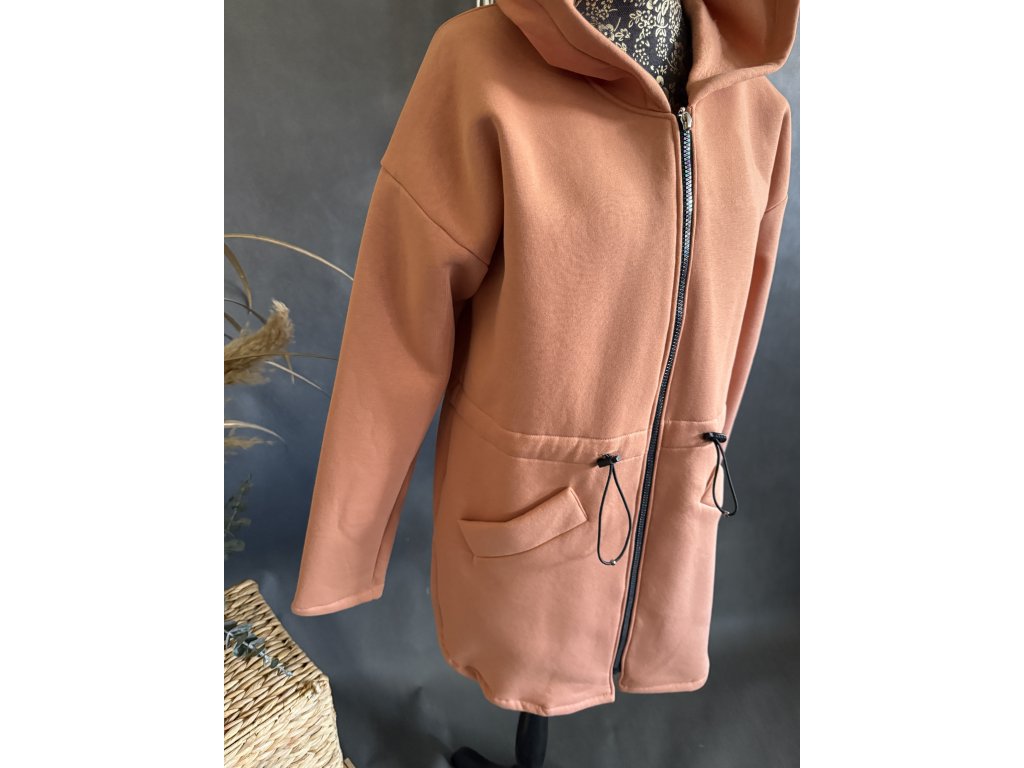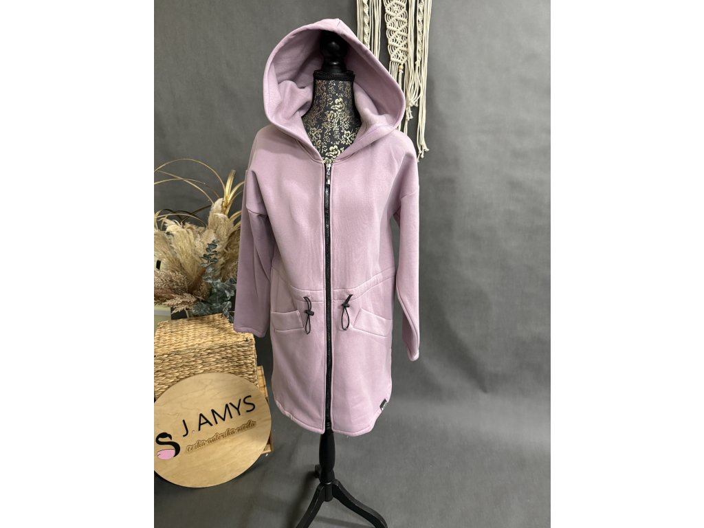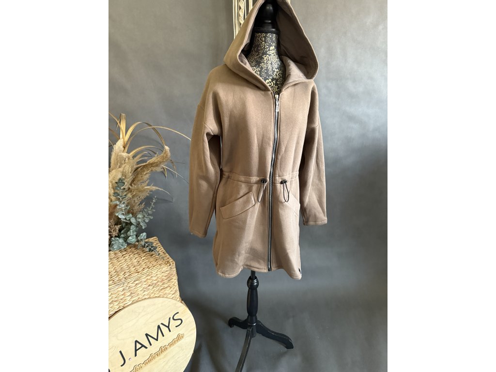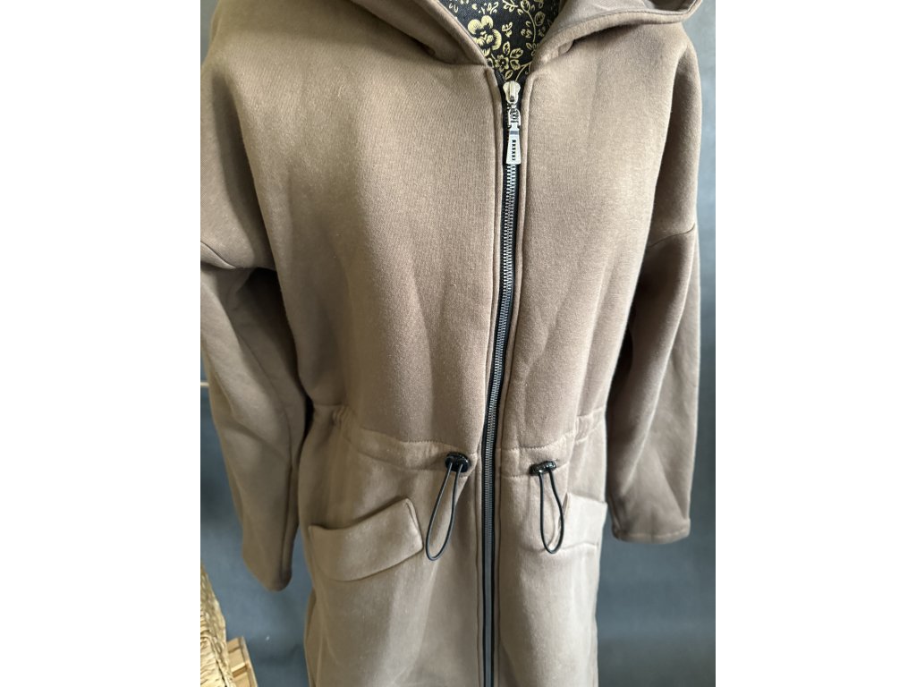 Elegantní mikina na zip s velkou kapucí a kapsami s gumou v pase. Velmi příjemná hřejivá teplákovina.