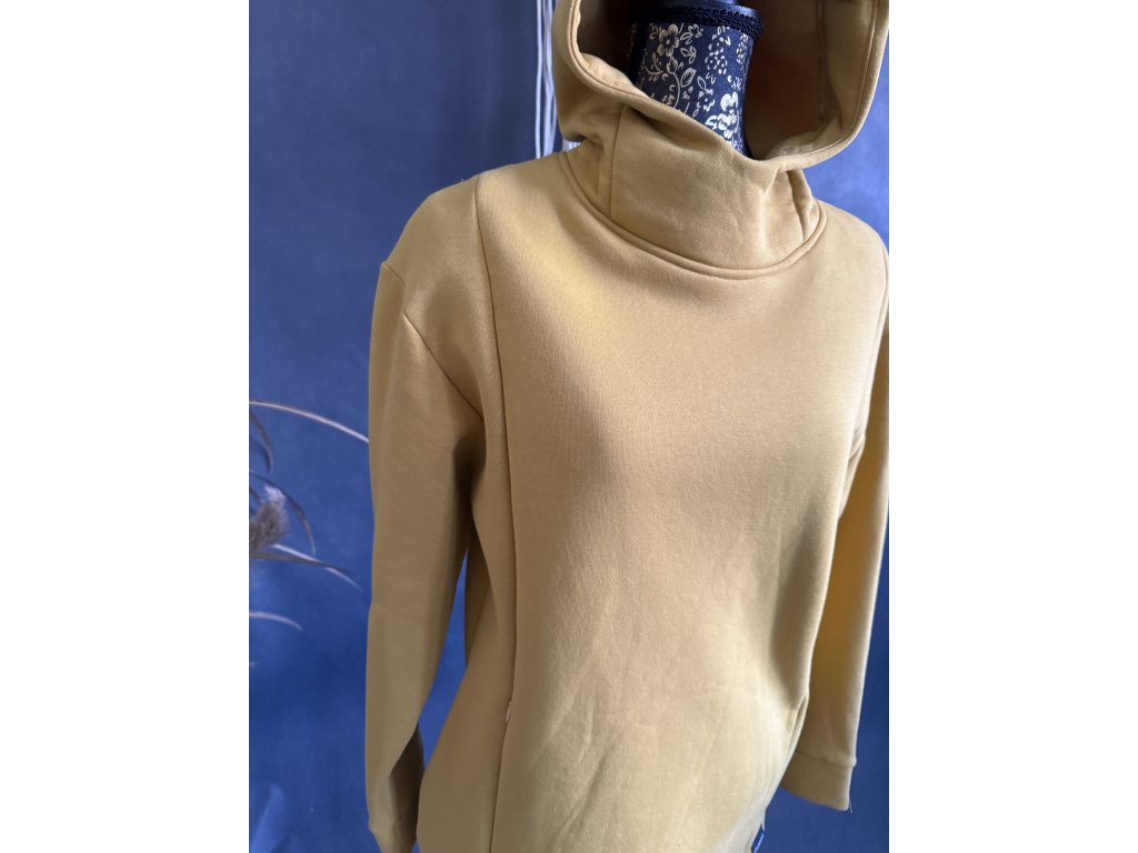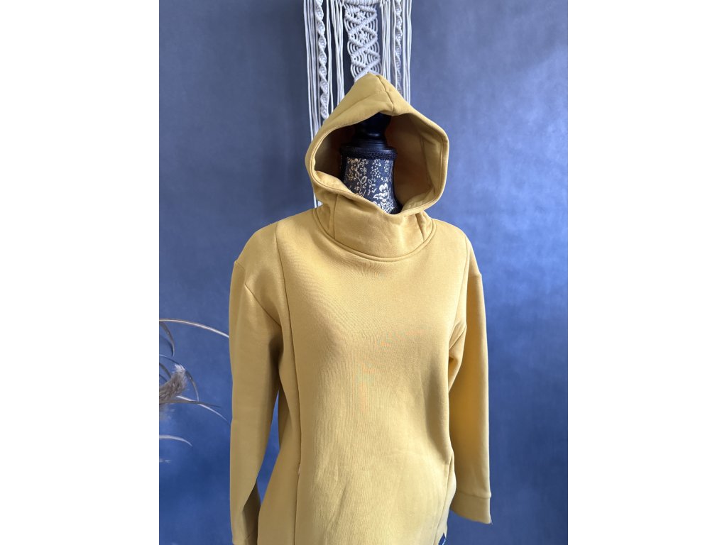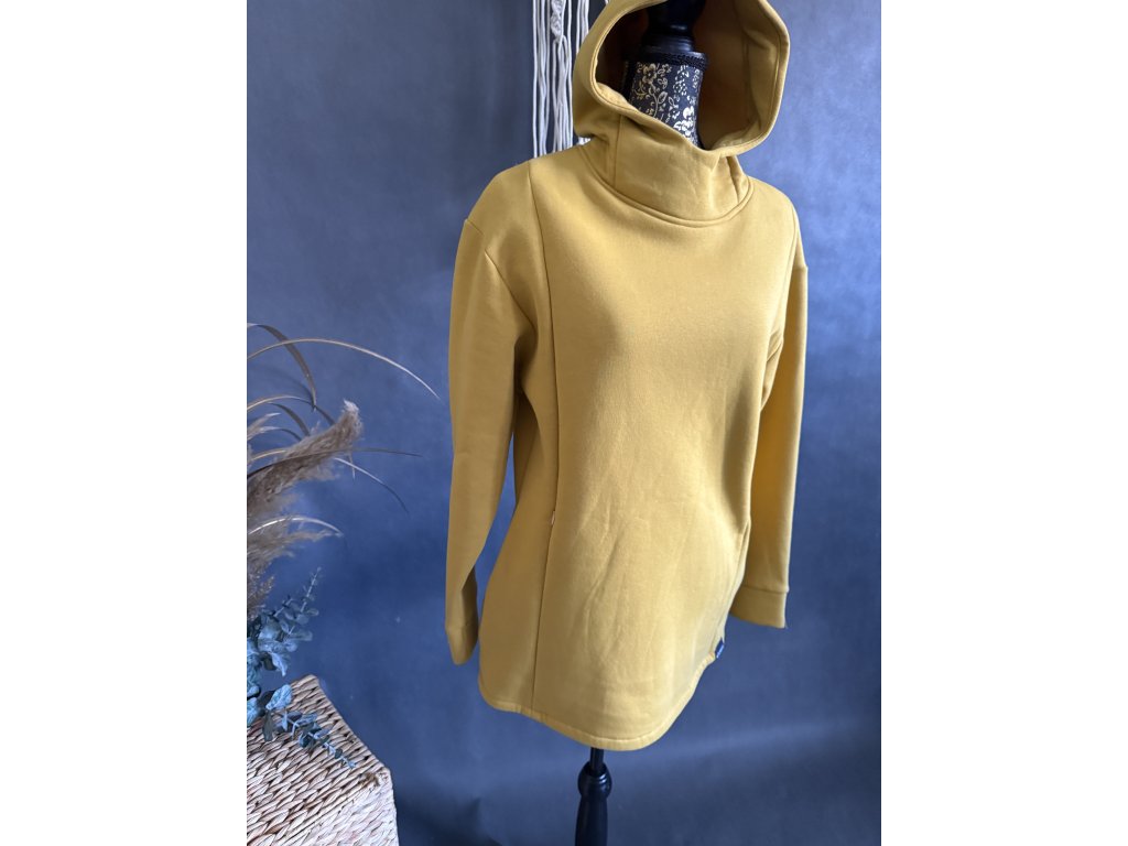 Hořčicová mikina s kapucí a kapsami a po stranách jsou skryté zipy na kojení.