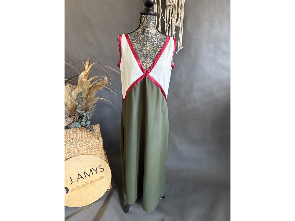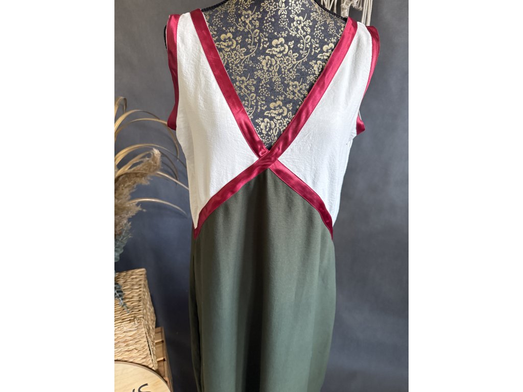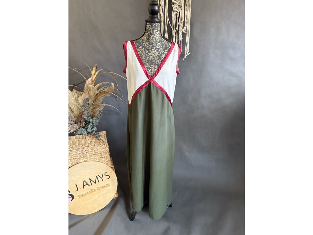 Krásné rafinované šaty s velkým výstřihem vepředu a vzadu. V barevné kombinaci červená, smetana, khaki. Velmi příjemné a vzdušné.