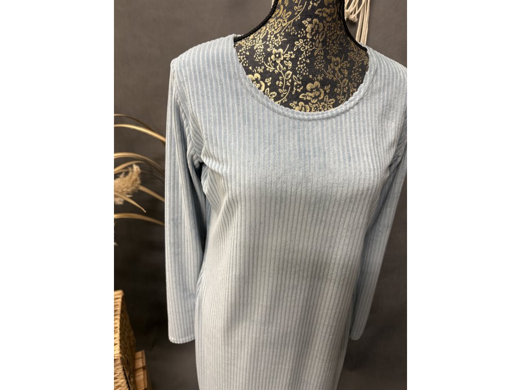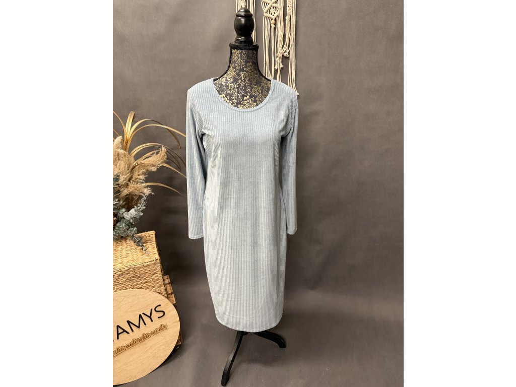 Šaty z jemného manšestru se skrytými zipy a dlouhým rukávem. Barva modrošedý jemný manšestr.