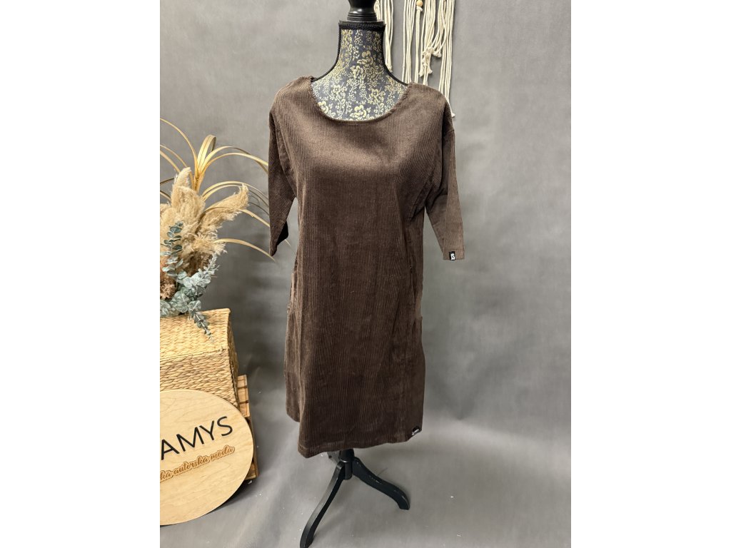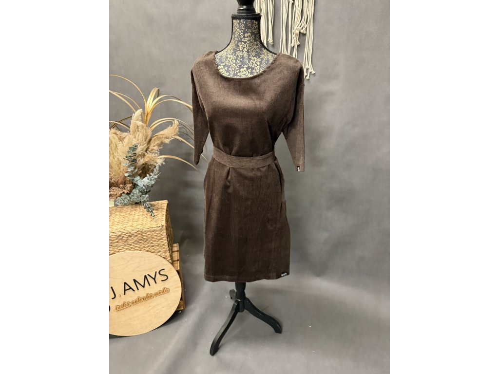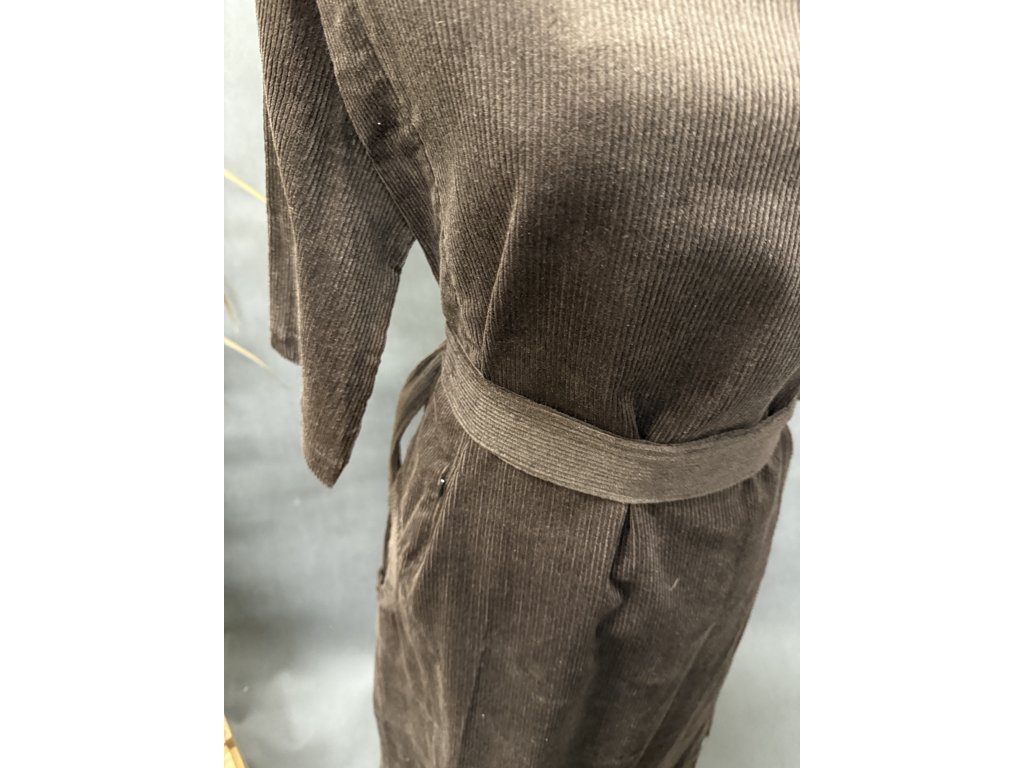 Šaty volnějšího střihu z manžestru jsou top. Šaty si můžete stáhnout páskem. Mají kapsy po stranách.