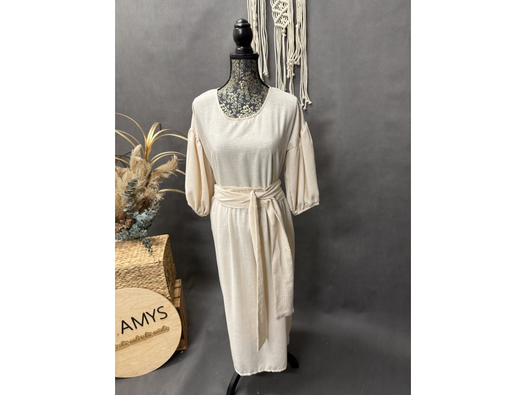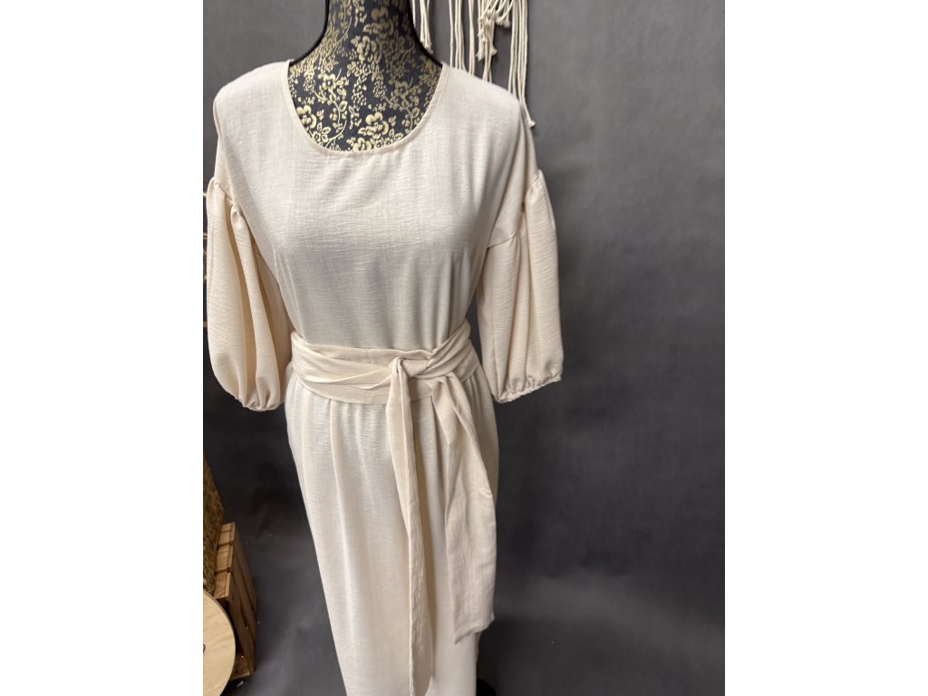 Lněné šaty v barvě smetanové. Šaty mají 3/4 rukáv do gumy, mají kapsy a dají se stáhnout širokým páskem.