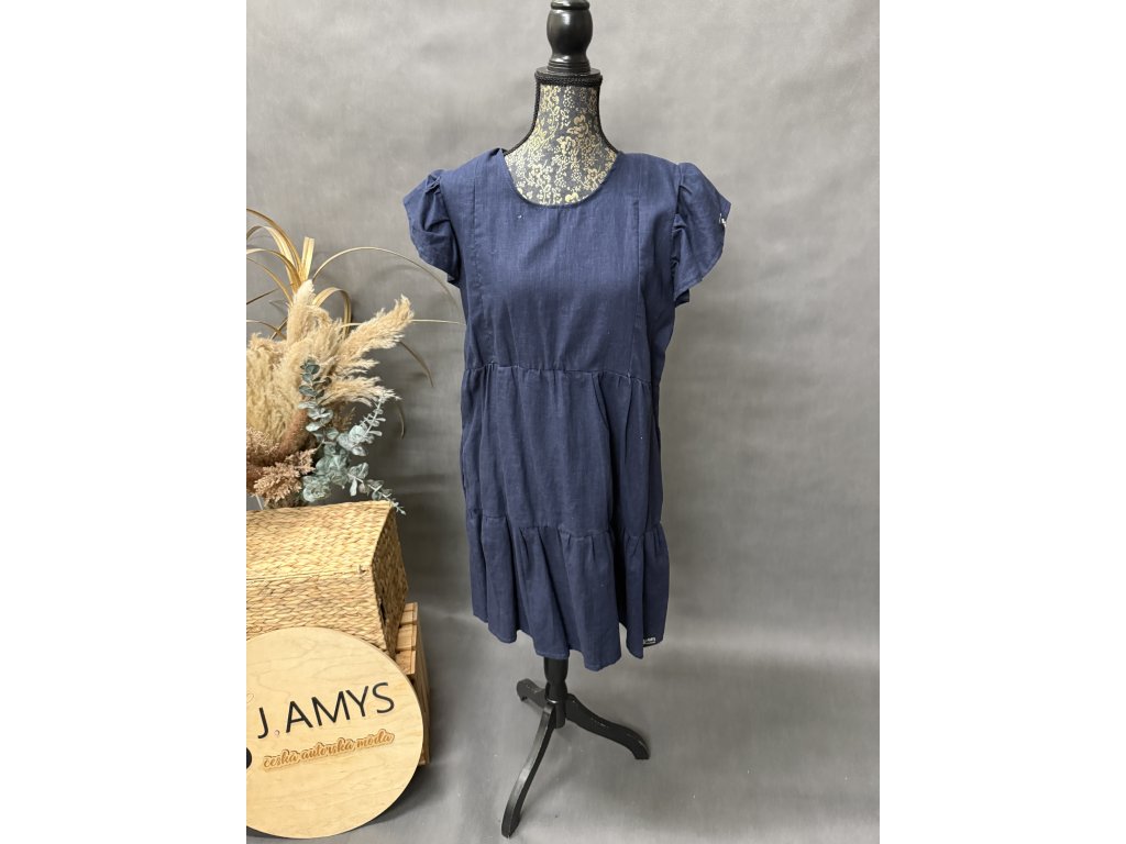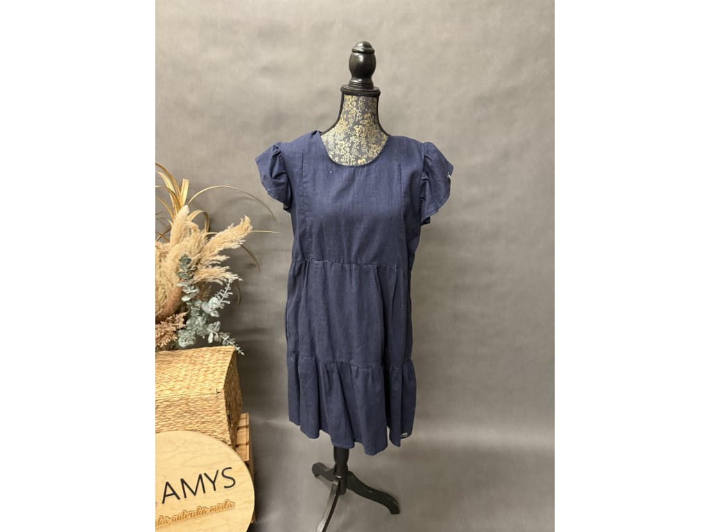 Nádherné lněné šaty s volánky a volánkový rukáv s kapsami. barva len tmavě modrý. Kojící.