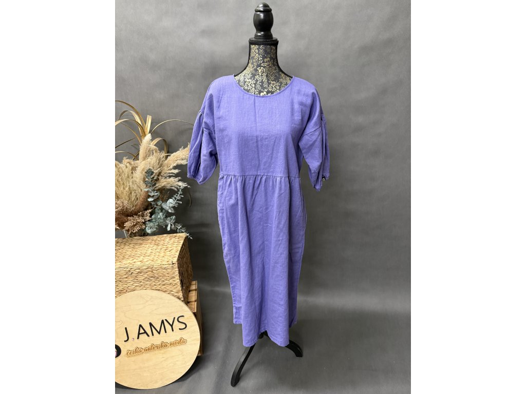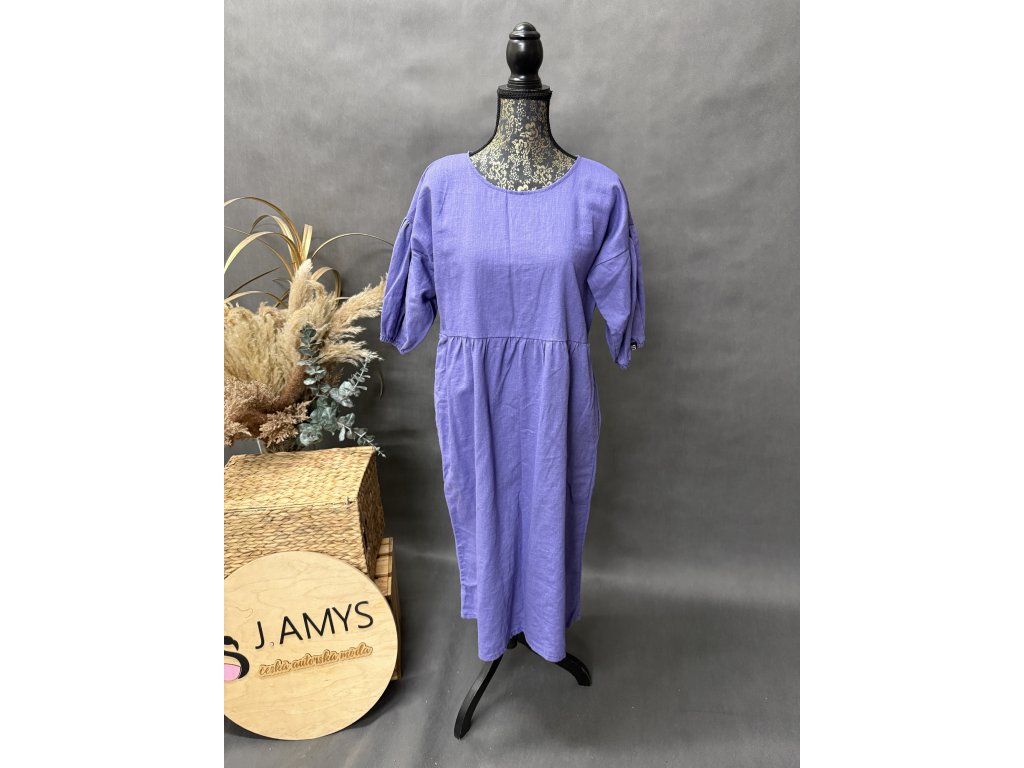 krásné lněné šaty s nabíranými rukávy a kapsami v barvě fialková.