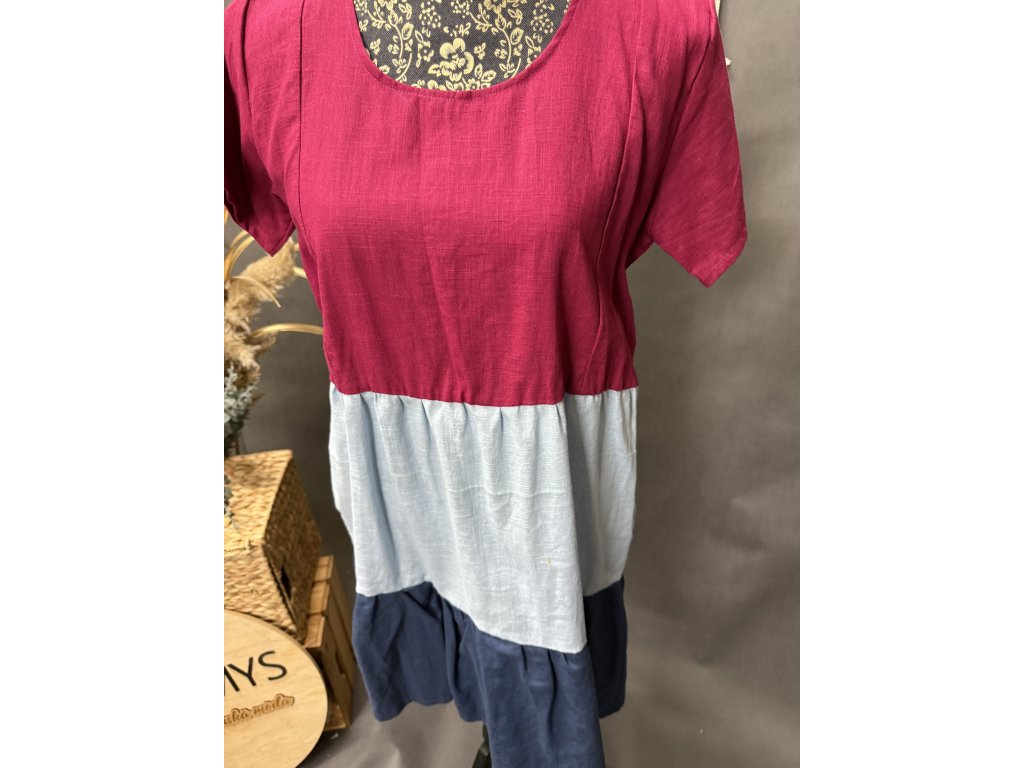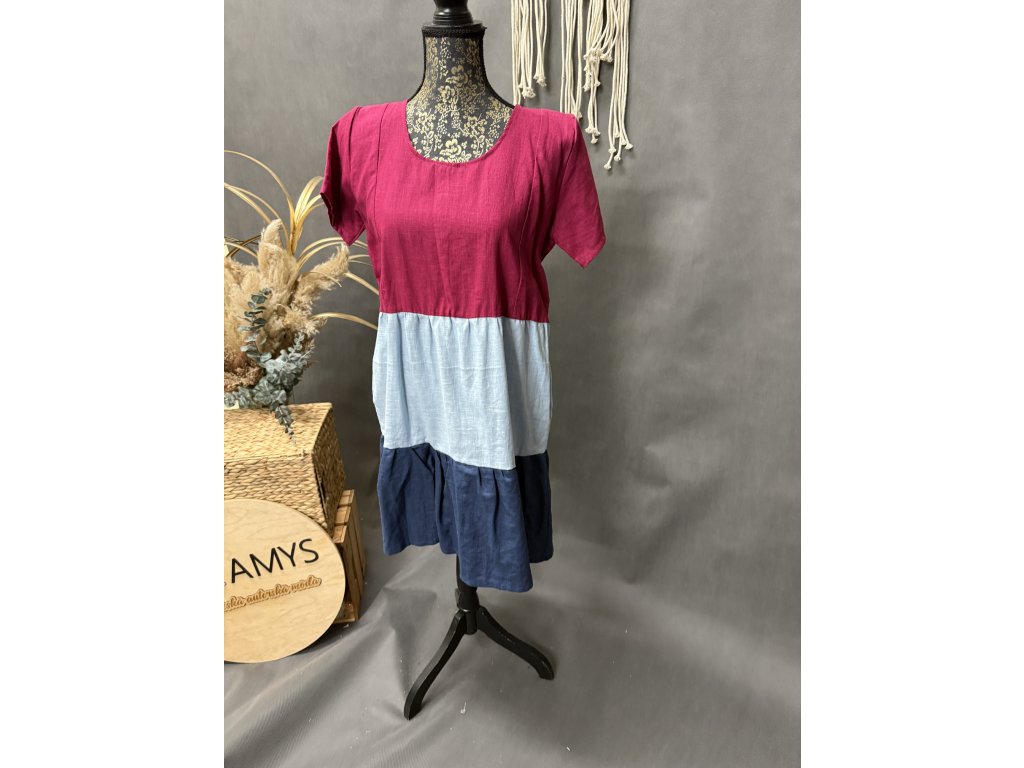Lněné tříbarevné volánkové šaty v barvě len vínový, světle modrý, a tmavě modrý. Jdou dodělat zipy na kojení