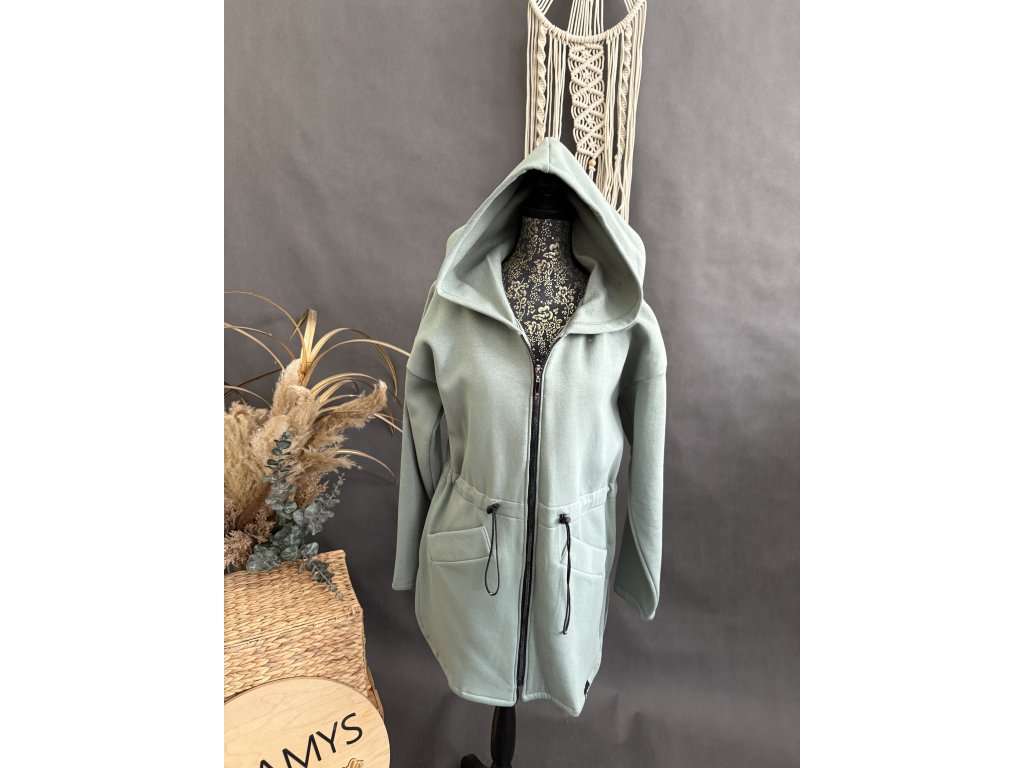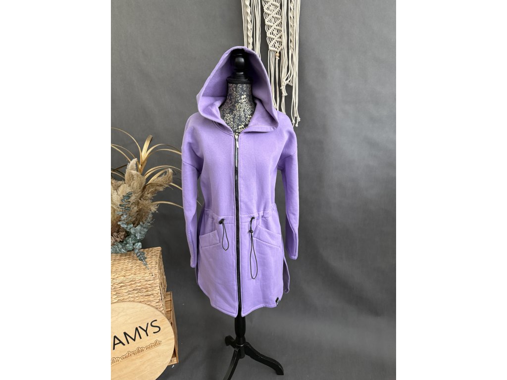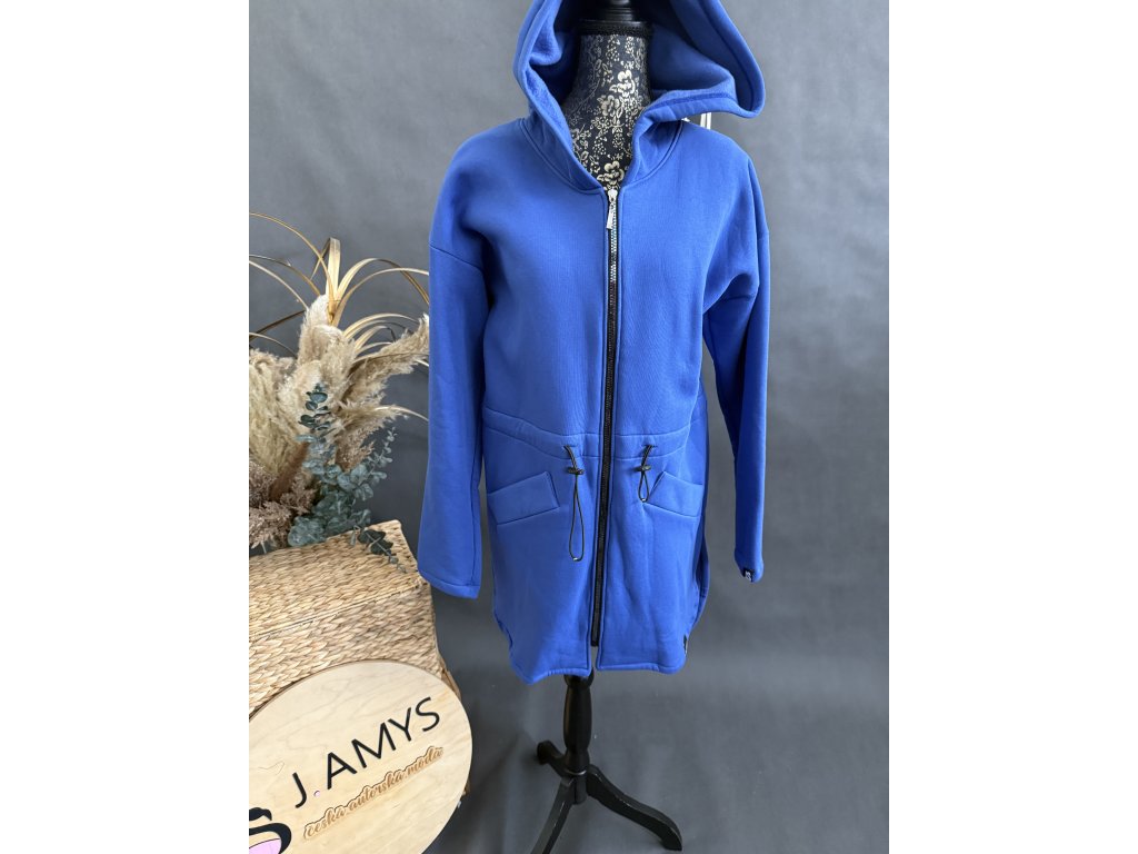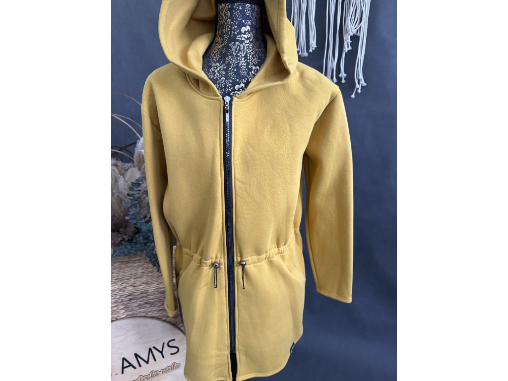 Elegantní mikina na zip s velkou kapucí a kapsami s gumou v pase. Velmi příjemná hřejivá teplákovina.