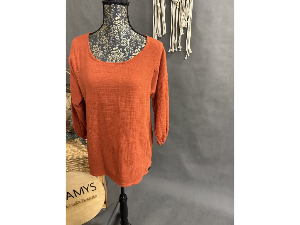 Nádherná mušelínová halenka s 3/4 rukávem do gumy v barvě cihla a se zisky na kojení.