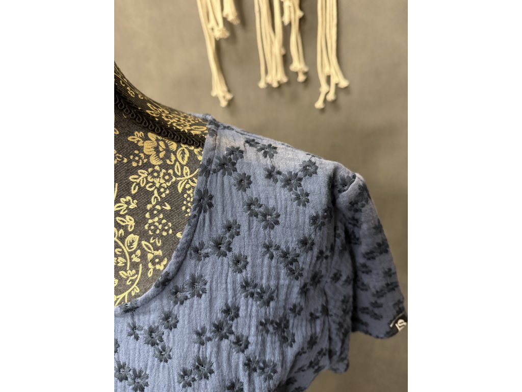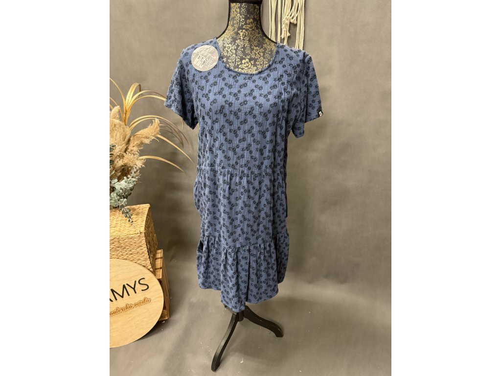 Nádherný vyšívaný mušelín v barvě tmavě modrý mušelín. Šaty jsou s volány a mají krátký rukáv. Velikost sedí od XS-M