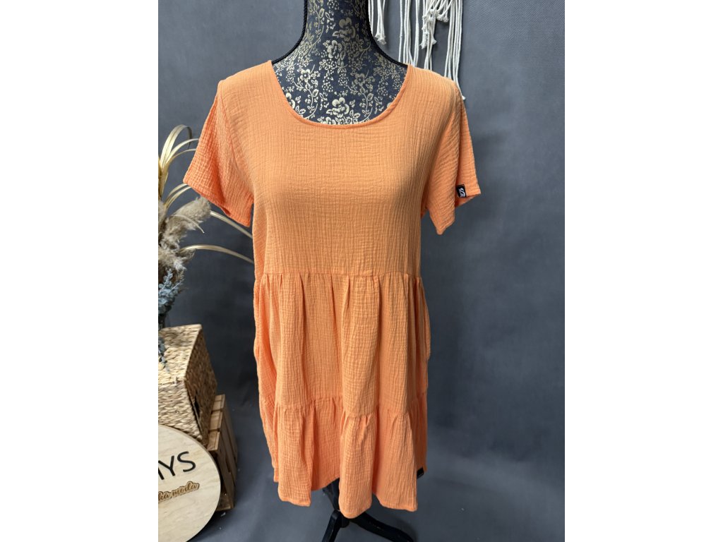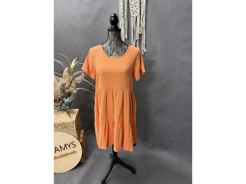Krásné oranž mušelínové šaty s volány a krátký rukáv a kapsami po stranách. Jsou ve variantě kojící a nekojící.