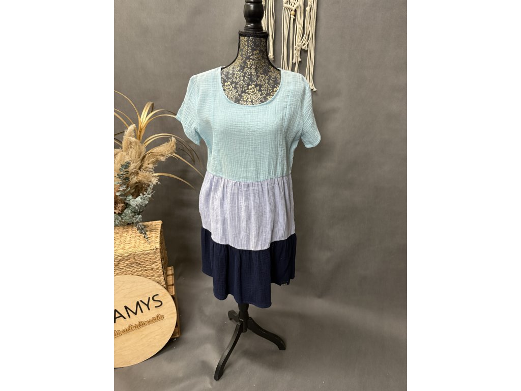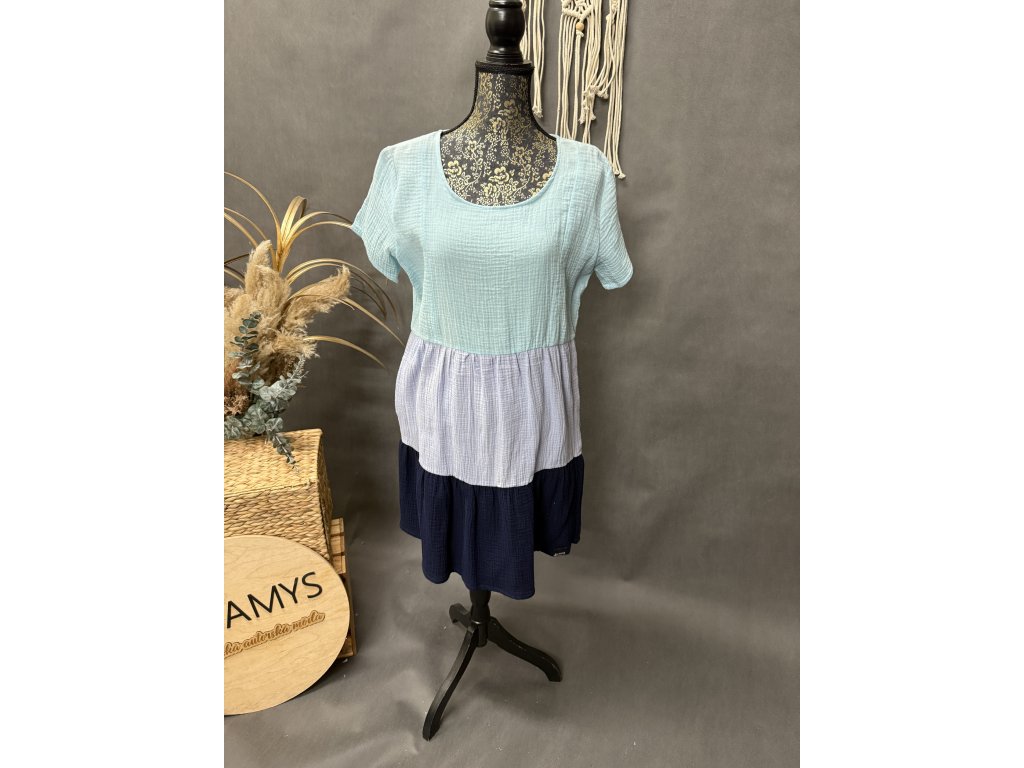 Nádherné tříbarevné mušelínové šaty v barvách světlešedý, modrý a Petrou mušelín s volány a krátký rukáv s kapsami po stranách. Šaty jsou nekojící.