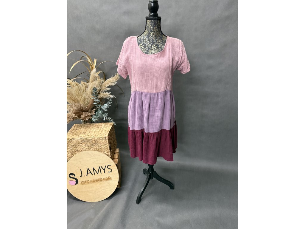 Nádherné tříbarevné kojící šaty s volány a krátký rukáv a šaty mají samozřejmě kapsy. Barva bordó, lila, růžová.