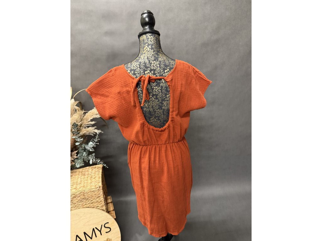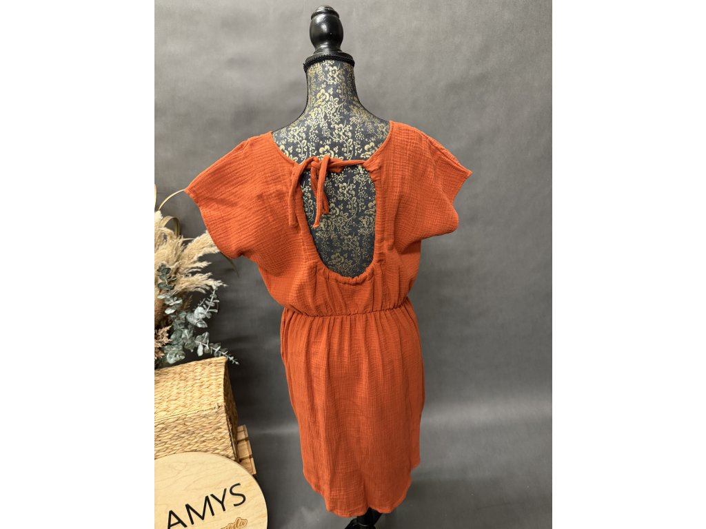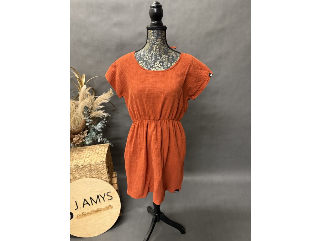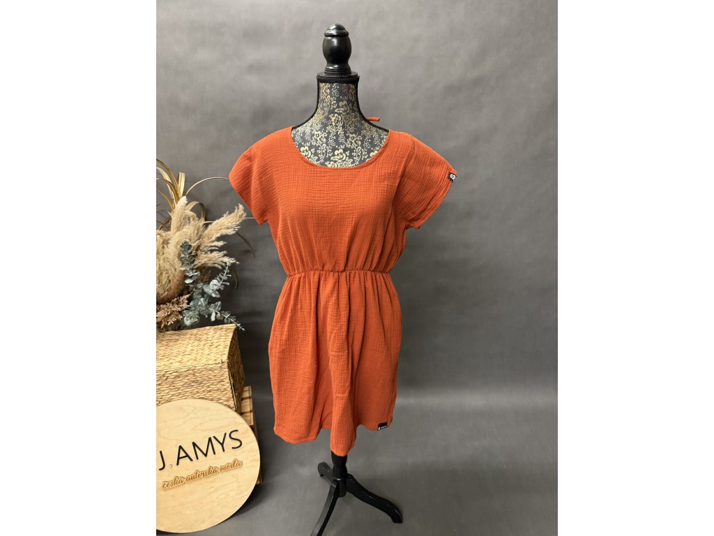 Nádherné mušelínové šaty s volnými zády v barvě cihla. Šaty mají kapsy. Velikost sedí od s-menší L.