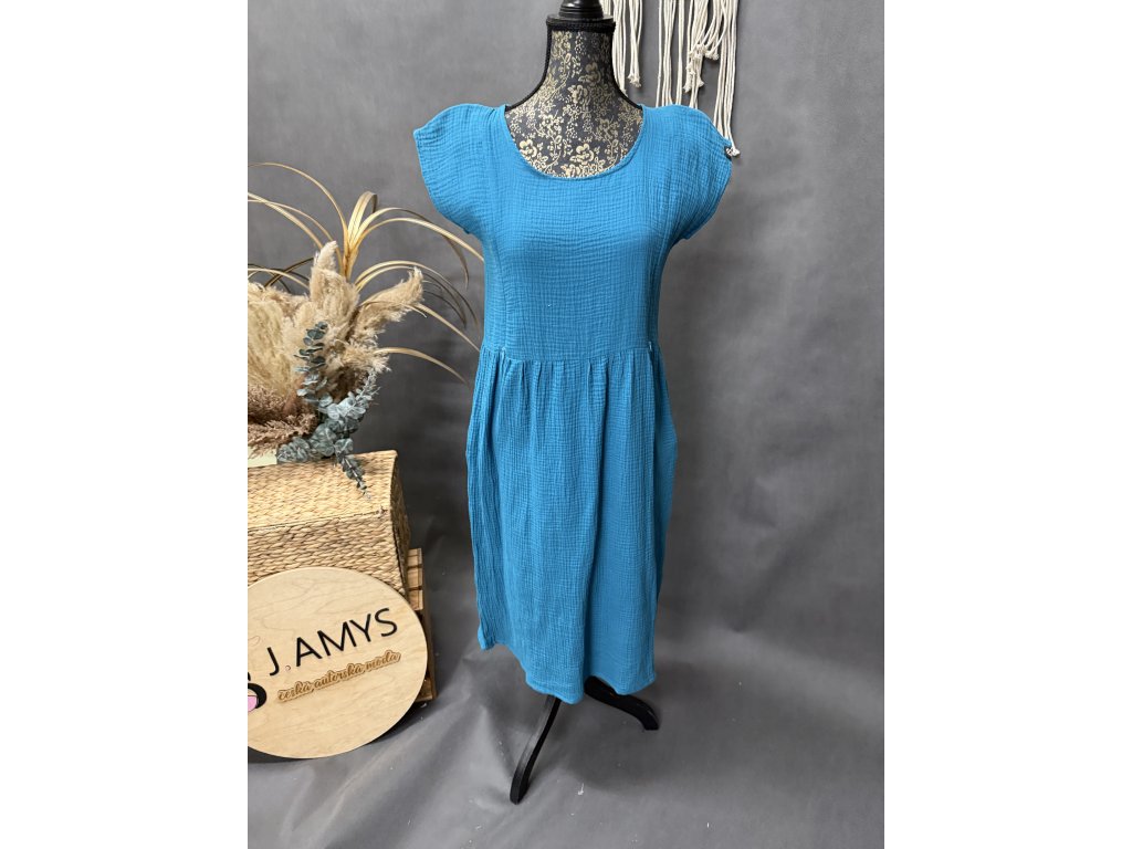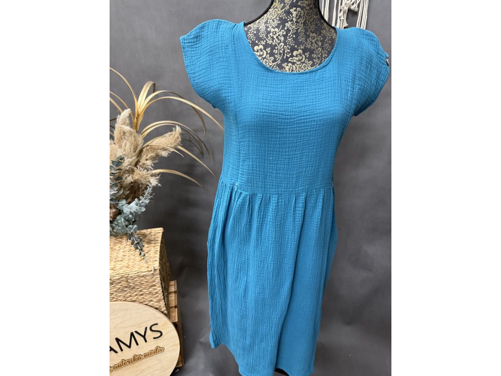 Nádherné mušelínové šaty s krátkým rukávem a kapsami po stranách. Barva mušelín petrol. Šaty jsou kojící.